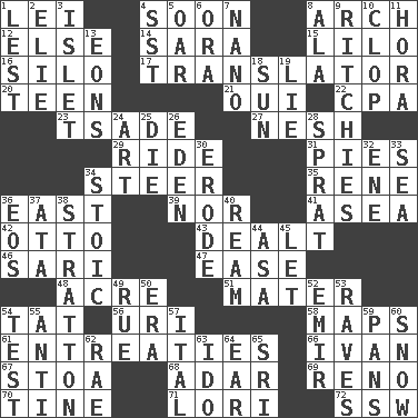 ACROSS 1. Luau accessory 4. Within a short period 8. Bowlike part 12. Otherwise 14. "Two Mules for Sister ____" 15. _ and Stitch 16. Grain storage tower 17. Interpreter 20. Adolescent 21. Fr. "Yes" 22. Tax preparer (abbr.) 23. Sadhe (variant) 27. Soft 29. Travel on an animal 31. Sliced desserts 34. Navigate 35. French philosopher Descartes 36. Compass direction 39. Not either 41. Toward the sea 42. Von Bismarck 43. Started a card game 46. Indian skirt 47. Relaxation 48. 1/640 square mile 51. Mother 54. Make lace 56. RI univ. 58. Atlas contents 61. Pleas 66. "Terrible" tsar 67. Portico 68. The sixth month of the Jewish calendar 69. Western Nevada city 70. Prong on a fork 71. Australian parrot (variant) 72. Compass dir. DOWN 1. For fear that 2. Writer Wiesel 3. Small island 4. Fast jet (abbr.) 5. Rowing implement 6. Mouth or opening 7. Billionth: prefix 8. Wing 9. Actors Guy, Robert Welles, and Clint 10. Hoof sound 11. Israeli folk dance 13. Immeasurably long periods of time 18. Player for Phoenix 19. Untruth 24. Nonscientific branch of learning 25. Expire 26. Locale of original sin 28. Small fatty European fish 30. Wear away 32. Compass dir. 33. Ocean 34. Unemotional 36. Greek goddess of the dawn 37. "One Day ___ Time" 38. Ski resort town in Vermont 40. 480, 500 or 516 sheets of paper 44. White ___ sheet 45. Allow 49. Regret 50. Period 52. Independent ruler or chieftain 53. All-night dance parties 54. Trial 55. Against 57. Slanted text style (abbr.) 59. Baking dishes 60. Overwhelm 62. Actress Charlotte 63. Wedding promise 64. Ewer handle 65. _ Lanka