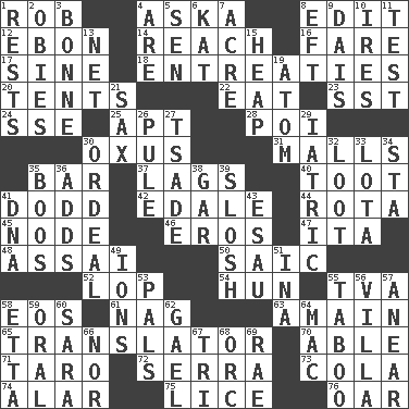ACROSS 1. Director Reiner 4. "____ silly question..." 8. Prepare for publication 12. Inky black, to poets 14. Arrive at 16. Conductor's collection 17. Trig term 18. Pleas 20. Portable shelters 22. Ingest 23. Fast jet (abbr.) 24. Compass dir. 25. Fitting 28. Luau course 30. The longest river in Central Asia 31. Promenades 35. Soap unit 37. Fails to keep up a pace 40. A blast of a horn 41. Texas town _ City 42. Peak District village in England 44. Roll call or roster of names 45. Thickened enlargement 46. Greek god of love 47. Call ___ day 48. Slender Brazilian palm 50. Ketch in the Levant 52. Trim (branches) 54. Attila the _ 55. Federal power corp. 58. Greek goddess of the dawn 61. Tired old horse 63. With great haste 65. Interpreter 70. Competent 71. Pacific island yam 72. Spanish missionary in California 73. Root beer relative 74. Having or resembling wings 75. Louse (plural) 76. Boat paddle DOWN 1. Musical pauses 2. Off-Broadway awards 3. Child's nurse 4. "We ___ not amused" (Victoria) 5. Elected rep. 6. Krazy ___ of comics 7. 1/640 square mile 8. Lizard (obsolete) 9. Raised platform 10. Angers 11. Trial 13. Remaining after all deductions 15. Pile 19. Tiny particle 21. Saxophone 26. Whine 27. Sadhe (variant) 29. Of or pertaining to medicine 30. Severe or trying experience 32. Spoils 33. Globular water bottle used in Asia 34. R.R. building 35. Expressions of contempt or scorn 36. Sums up 38. Slender fish 39. Make a splashing sound 41. Heredity factor (abbr.) 43. He sold his birthright 49. Charged atoms 51. _ tizzy (2 wds.) 53. Friends 55. Off limits 56. Country estate 57. Approach 58. Singer James 59. Relating to the mouth 60. "Two Mules for Sister ____" 62. Highlander 64. Big _ 66. And not 67. Three (prefix) 68. The grampus (Milton) 69. Actress Charlotte