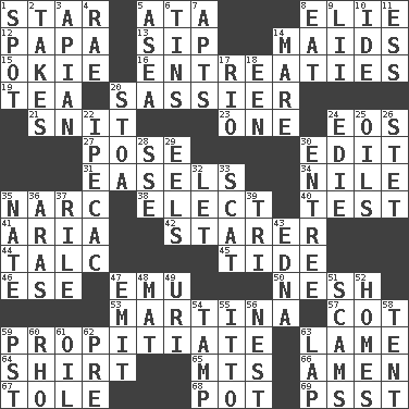 ACROSS 1. Play the lead 5. _ moment's notice (2 wds.) 8. Writer Wiesel 12. Dad 13. Small drink 14. Women servants 15. Migrant worker of the '30s 16. Pleas 19. Beverage made from leaves 20. More impudent 21. In a ____ (agitated or irritated) 23. Single 24. Greek goddess of the dawn 27. Airs 30. Prepare for publication 31. Artist's stands 34. Mediterranean tributary 35. Drug cop 38. Voters do this 40. Trial 41. Operatic vocal solo 42. A viewer who gazes fixedly 44. Baby powder 45. Periodic rise and fall of the sea level 46. Compass dir. 47. Australian flightless bird 50. Delicate 53. Chrissie's court nemesis 57. Small bed 59. Conciliate 63. Unable to walk 64. Chest covering 65. Mountains (abbr.) 66. So be it 67. Lacquered or enameled metalware 68. Plant holder 69. Inconspicuous attention getter DOWN 1. Blemish 2. Proceeds 3. Bee-related 4. Actress Charlotte 5. Toward the sea 6. Canisters 7. Tenement units (abbr.) 8. Ingest 9. Cards in a Roman deck? 10. Binary compound 11. Curvy letter 14. Female horse 17. River (Sp.) 18. Car or cant ending 20. Portico 22. Medicinal drug used to evoke vomiting 24. Singer Brickell 25. Lubricates 26. Proofreading order 28. Compass dir. 29. Snakelike fish 30. Main course 32. Allow 33. Get outta here! 35. Nathan's nickname 36. Caspian sea tributary 37. Cause heat under the collar 39. Three (prefix) 43. Pulitzer Prize-winning author Ferber 47. Send forth 48. Floor protector 49. RI univ. 51. Fraudulent business schemes 52. Dwellings 54. Pack (down) 55. "Tell ____ the Marines!" 56. Egg locale 58. Portable shelter 59. Pacific Standard Time (abbr.) 60. 17th letter of the Greek alphabet 61. Petroleum 62. Before (prefix) 63. Infant locale