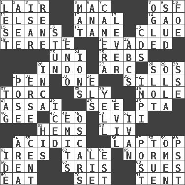 ACROSS 1. Den 5. Apple computer (short form) 8. Order of Saint Francis (abbr.) 11. Otherwise 12. Of or related to the anus 14. E Mali city 15. Seines 17. Not wild 18. A slight indication 19. Cylindrical with tapered ends 21. Dodged 23. Single; one (prefix) 25. Confederate soldiers (slang) 26. _ china 27. Curve 28. Distress signal 31. Animal enclosure 33. Single 35. Beverly of Met fame 37. Torque (variant) 38. Secret 40. Undercover agent 41. Slender Brazilian palm 43. Observe 45. Parent Teacher Association (abbr.) 46. Turn to the right 47. Corporate head (abbr.) 50. 57 in ancient Rome 52. Equivocates 53. 54 in ancient Rome 54. Being or containing an acid 56. Portable computer 61. Angers 62. Falsehood 65. Typical standards 66. Lair 67. Indian titles of respect 68. Takes to court 69. Ingest 70. Put into a specified state 71. Portable shelter DOWN 1. For fear that 2. Toward shelter 3. Austrian river, tributary to the Danube 4. French philosopher Descartes 5. Floor covering 6. Santa ___, CA 7. Device for capturing images 8. Stare at amorously 9. Saudi Arabian king (1953-1964) 10. Enemy 13. Prying instrument 16. Astound 18. Music discs 20. Inside; within (prefix) 22. Lettered men learn these first 24. Charged atoms 26. South American Indian 28. Notch 29. Spanish pot 30. Compass dir. 31. Airs 32. Celtic language 34. Raised railways 36. Body of Kaffir warriors 37. Label 39. Shout 42. On the rocks 44. Morally bad or wrong 48. Sends forth 49. Motion picture awards 51. _ the terrible 52. Part of HMS, perhaps 54. Length times width 55. Penny 57. Mail 58. Loyal 59. Presage 60. Inconspicuous attention getter 61. Binary compound 63. Falsehood 64. Eastern Standard Time (abbr.)