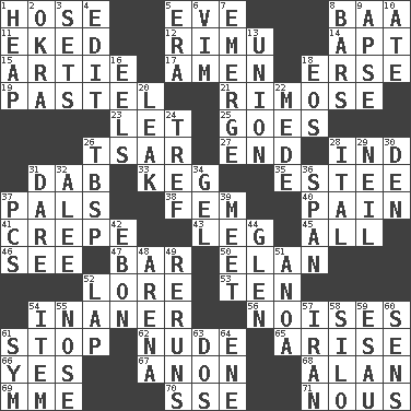 ACROSS 1. Stockings 5. First lady 8. Sound made by sheep 11. Supplemented with great effort 12. Tall New Zealand timber tree 14. Fitting 15. Nick name for Arthur 17. So be it 18. Celtic language 19. Soft color 21. Full of chinks, cracks, or crevices 23. Allow 25. Moves 26. Russian ruler of old 27. Conclusion 28. Indiana (abbr.) 31. Pat or tap gently 33. Cask 35. First name in cosmetics 37. Friends 38. Opposite of masc. 40. Ache 41. Streamer paper 43. Part of a journey 45. Everything 46. Observe 47. Soap unit 50. Style 52. Old wives' tales, e.g. 53. Nine, plus one 54. More empty; more void 56. Annoying sounds 61. Close up, plug up 62. Naked 65. Originate 66. Consenting reply 67. Soon (poet.) 68. ____ Jay Lerner 69. Madame (abbr.) 70. Compass dir. 71. Good sense DOWN 1. Pile 2. Gumbo ingredient 3. Arranges properly for use 4. Prepare for publication 5. Period 6. Zeal 7. Develop 8. Drinking establishments 9. Domed church section 10. Had dinner 13. The state of being joined or united 16. Snakelike fish 18. Greek goddess of the dawn 20. Path through which fluid escapes 22. Ancient Persian 24. Unclean, religiously 26. Cook's measure (abbr.) 28. Slanted text style (abbr.) 29. Famous astronaut Armstrong 30. Lair 31. Have the gumption 32. Toward shelter 34. Set 36. Connect, as a bridge 37. Personal Computers (abbr.) 39. Confront 42. Inky black, to poets 44. Small, secluded valley 48. Sports stadium 49. Summer TV shows 51. Small Philippine buffalo 52. Infant locale 54. Detail 55. Sense of smell 57. SW Asia republic 58. Grain storage tower 59. He sold his birthright 60. Elected reps. 61. Symbol (abbr.) 63. Two (Sp.) 64. Compass dir.