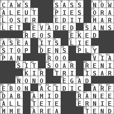 ACROSS 1. Crow sounds 5. Backtalk 9. Immediately 12. Eskimo relative 14. Sliced desserts 15. Mouth or opening 16. Failure 17. Prepare for publication 18. Spoil 19. Allow 20. Eluded 23. Without 24. Vintage cars 25. Made supply last 27. At sea 30. ___ a Wonderful Life 32. Falsehood 33. Halt 34. Cub Scout units 36. Apply oneself diligently 38. Baking dish 39. Friend of Pooh 40. By way of 43. Be seated 46. Fly high 48. Painter Guido (1575-1642) 49. Apertif with cassis 51. Three (prefix) 52. Austrian river, tributary to the Danube 53. Words to Nanette 54. Mild oath 56. Inky black, to poets 58. Being or containing an acid 61. Sandy's bark 64. Apply (a substance) by light strokes 65. Among 66. The wife of a rajah (variant) 68. 100% 69. False hair 70. Bert's buddy 71. Madame (abbr.) 72. Type of rug 73. Watch over DOWN 1. Give a ring to 2. Medicinal plant 3. 270 degrees 4. Institute legal proceedings 5. Broke a traffic law 6. Assistant 7. A glass for beer 8. Fast jet (abbr.) 9. Roamer 10. Northwest Algerian city 11. Armed conflicts 13. Family _ (genealogy) 21. Nothingness 22. Michaelmas daisies 23. Sew up the eyelids of hawks and falcons 24. Reproach for some lapse or misdeed 26. Sleep 27. Cleo's killer 28. R.R. building 29. Immeasurably long periods of time 31. Snout, nose 35. Flew 37. Jacques Cousteau's middle name 41. _ tizzy (2 wds.) 42. Atmosphere 44. Visual representation of an object 45. Metal container 47. Swiss mountan, "Queen of the Mountains" 48. To free from 50. Nomad 53. Impressive in appearance 55. Land measure 56. Dutch treat 57. Lip ointment 59. Quote 60. The main thing one is thinking about 61. Singer Murray 62. It's straight from the horse's mouth 63. Nourish 65. _ moment's notice (2 wds.) 67. Tate display