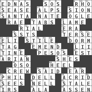 ACROSS 1. Ferber et al. 6. Mayday 9. 17th letter of the Greek alphabet 12. Gospel singer Marvin 13. High mountains 14. The Jewish people; Israel 15. Before Barbara or Clara 16. Nathan's nickname 17. Stare 18. Actress Charlotte 19. Bar bills 20. Unable to walk 21. Monetary unit of Yemen 23. Epoch 24. Fast planes 25. Laconic 28. Biblical high priest 30. Vertical member of a panel or frame 34. Dormintory (informal) 35. Label 36. Make improvements or corrections to 38. Cards in a Roman deck? 39. Prong on a fork 41. Mexican monetary units 43. Eastern Standard Time (abbr.) 44. Believer in; advocate of (suffix) 46. "______ My Girl" (Turtles hit) 48. Bear (Spanish) 49. Person who is morally reprehensible 50. Group working together 51. Stated 53. Hearing organ 56. Silvers or Donahue 57. Small valley 58. Sour-tasting 60. Observes 61. 1994 drama film starring Jodie Foster 62. Lacking originality or spontaneity 63. Big collection agency 64. Chicken ___ king 65. NE Netherlands city DOWN 1. Double-curved letter 2. Letter starter 3. Nanny 4. Michaelmas daisies 5. Ocean 6. Broad, flat, thick piece 7. Elects 8. Compass dir. 9. Frustrating wastes of time 10. Opening into or through something 11. Single 13. Of or related to the anus 14. Flew 19. Clothes sense 20. Allow 22. It is 24. Seigniories (variant) 26. Indian titles of respect 27. Give off 28. Singer James 29. Den 31. Mischievous child 32. Area sheltered from the wind 33. Followers of ems 37. Administered medicine 40. Artist's stands 42. A female animal or person 45. Immediately 47. Chooses 49. Land elevation 50. "Mermaids" star 51. Sew up the eyelids of hawks and falcons 52. Silent film actress Nazimova 54. Ancient river in northeast Turkey 55. Cause heat under the collar 56. 23rd letter of the Greek alphabet 57. Heredity factor (abbr.) 58. White ___ sheet 59. Lair
