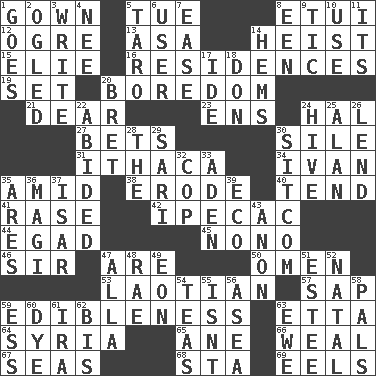 ACROSS 1. Long dress 5. Third day of the wk. 8. Needle holder 12. Legendary monster 13. White ___ sheet 14. Robbery 15. Writer Wiesel 16. Dwellings 19. Arrange properly for use 20. Mood resulting from idleness 21. Letter starter 23. Followers of ems 24. Actor Linden 27. Stakes 30. Filth; sediment 31. New York city 34. _ the terrible 35. Among 38. Wear away 40. Look after 41. Raze (variant) 42. Medicinal drug used to evoke vomiting 44. Mild oath 45. Words to Nanette 46. Title for a knight 47. "We ___ not amused" (Victoria) 50. Presage 53. Of or relating to Laos or its people 57. Plant excrement 59. The property of being fit to eat 63. Singer James 64. Damascus' land 65. One (Scot) 66. Welt 67. Oceans 68. R.R. building 69. Snakelike fish DOWN 1. Travels 2. Stared 3. Compose 4. Born 5. Edible starchy tuberous root 6. One who makes use of a thing 7. Comfort 8. Car or cant ending 9. Nervous spasm 10. Purpose 11. ___ a Wonderful Life 14. Is hesitant and indecisive 17. Binary compound 18. Spanish title 20. Cy Young winner Saberhagen 22. Tolerated 24. Hub of activity 25. ____ Jay Lerner 26. Grant temporary use of 28. Definite Article 29. Indian skirt 30. "Cheers" or "Ellen" 32. Police officer (slang) 33. An important port of Yemen 35. Ancient Greek god of war 36. Wise men 37. Austrian river, tributary to the Danube 39. Environmental prefix 43. At once, immediately (arch.) 47. Silent film actress Nazimova 48. Actress Charlotte 49. A really long time 51. First name in cosmetics 52. Relating to or accompanying birth 54. Afternoon social gatherings 55. Is not 56. At sea 58. Friends 59. Double-curved letter 60. Color 61. Lyricist Gershwin 62. Again 63. She-sheep