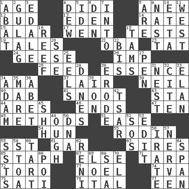 ACROSS 1. Personal question 4. "You Light Up My Life" star Conn 8. Afresh 12. Partially opened flower 13. Genesis locale 14. Pace 15. Having or resembling wings 17. Gone 18. Trials 19. Stories 21. Chief or king in Benin or Nigeria 23. Make lace 24. Honkers 26. Naughty child 28. Nourish 30. Substance 34. Nursemaid (var.) 37. Den 39. Famous astronaut Armstrong 40. Small moist lump or mass 41. Snout, nose 43. R.R. building 44. Ancient Greek god of war 46. Conclusions 47. Nine, plus one 48. Modes 51. Comfort 54. Attila the _ 55. "The Thinker" sculptor 58. Fast jet (abbr.) 61. Slender fish 63. Fathers 65. Staphylococcus 67. Otherwise 71. Canvas cover 72. "Corrida" creature 73. Christmas carol 74. Federal power corp. 75. Suttee (variant) 76. Slanted text style (abbr.) 77. Car or cant ending DOWN 1. Blind as ____ 2. POW camp 3. Peak District village in England 4. Morning condensation 5. Binary compound 6. Lair 7. To the inside or interior of 8. "We ___ not amused" (Victoria) 9. Political cartoonist Thomas 10. Singer James 11. Compass direction 16. Coral ridge 18. Scottish caps 20. Compass dir. 22. Altar cloth linen 25. Snakelike fish 27. Writing instrument 29. Natives or inhabitants of Denmark 30. Eat (away) 31. A home for chicks 32. Quote 33. Enthusiasm 34. First man 35. Female horse 36. Collude with 38. Electrically charged atom 42. Russian ruler of old 45. Quiet! 49. Ending for "Through" and "Enough" 50. Heredity factor (abbr.) 52. Mayday 53. Prepare for publication 56. Feeling or showing extreme anger 57. Impudent aggressiveness 58. Fast planes 59. Portico 60. Small pie 62. Painter Guido (1575-1642) 64. Connect, as a bridge 66. Luau course 68. Car dealer's back yard 69. Ocean 70. Pipe bend