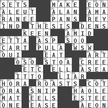 ACROSS 1. Arranges properly for use 5. Create 9. Period of immesurable duration 12. Eskimo relative 14. Actor Alda or Thicke 15. Nursemaid (var.) 16. Indian princess (variant) 17. Zero-star reviews 18. Marina Del _, California 19. Working for oneself (abbr.) 20. College paper 23. Lairs 24. Peachy ____! 25. Among 27. Singer James 30. Viper 32. "Barney Miller" actor Jack 33. Heavy open wagon 34. Monetary unit of Botswana 36. Compass dir. 38. Fr. "Yes" 39. Consume 40. Tate display 43. Bear (Spanish) 46. Portico 48. Algonquian 49. And so on (abbr.) 51. Pipe bend 52. Toward the sea 53. "Tell ____ the Marines!" 54. One who doesn't tell the truth 56. Israeli folk dance 58. Ridicules or criticizes harshly 61. Small bed 64. Mouth or opening 65. Clip 66. White Person, in Hawaii 68. Floor protector 69. Snakelike fish 70. First name in cosmetics 71. Single 72. Comfort 73. A really long time DOWN 1. Indian skirt 2. Flair 3. Be inclined (to) 4. Institute legal proceedings 5. Atlas contents 6. Mountain range southwest of Kyrgyzstan 7. Sunflower state 8. Followers of ems 9. Having ears or earlike features 10. Sign of something about to happen 11. Negative votes 13. Wig 21. Pile 22. Follows as a consequence or result 23. "Vaya con ____" 24. Krazy ___ of comics 26. Cut the grass 27. Environmental prefix 28. The 19th letter of the Greek alphabet 29. Musical group of three 31. Food holder 35. Ringlike coral islands and reefs 37. Armed conflicts 41. To sift 42. Beverage made from leaves 44. Bristle 45. Baseball player Mel 47. Set down 48. Auto 50. Pupil covering 53. Feeling or showing extreme anger 55. American tennis player Robert 56. Like (prefix) 57. NW Algerian seaport 59. Lubricates 60. Domed church section 61. ____ d'Azur (French Riviera) 62. Margarine 63. Adolescent 65. Perceive with the eye 67. White ___ sheet