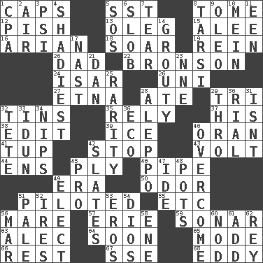 ACROSS 1. Smile enhancers 5. Fast jet (abbr.) 8. Heavy book 12. Expression of disdain 13. Cassini of fashion 15. Toward shelter 16. Believer in; advocate of (suffix) 18. Fly high 19. It's straight from the horse's mouth 20. June honoree 22. "Death Wish" actor 24. Austrian river, tributary to the Danube 26. Corn or form start 27. Inactive volcano in Sicily 28. Had dinner 29. Three (prefix) 32. Metal containers 35. Depend 37. Part of HMS, perhaps 38. Prepare for publication 39. Frozen water 40. Northwest Algerian city 41. Uncastrated adult male sheep 42. Halt 43. Electrical Unit 44. Followers of ems 45. Strand of rope, yarn or thread 46. Corncob 49. Epoch 50. Aroma 51. Manned the helm 55. And so on (abbr.) 56. Female horse 57. 4th largest of the Great Lakes 59. Underwater navigation system 63. Actor Baldwin 64. Within a short period 65. Method 66. Repose 67. Compass dir. 68. Whirlpool DOWN 1. Accounting whiz (abbr.) 2. Atmosphere 3. 23rd letter of the Greek alphabet 4. Most dark, concealed or hidden 5. Distress signal 6. Oscar Madison type 7. Pull into pieces 8. Tarsus (plural) 9. Butter sub 10. Chow _ 11. Car or cant ending 14. Sulky 17. Political cartoonist Thomas 21. One of the 12 tribes of Israel 23. Compass dir. 25. Noteworthy scarcity 28. City in Syria 29. Through, poetically 30. Monetary unit of Yemen 31. Is not 32. Wig 33. Goddess of spring and wife of Bragi 34. Cuts off 36. Environmental prefix 40. Conquer 42. Chalkboards 45. Adept person 47. Binary compound 48. Plant holders 49. Voters do this 51. Light colored 52. Angers 53. Greek god of love 54. "Vaya con ____" 56. Impair 58. Compass dir. 60. Dreamland 61. Say or write further 62. Marina Del _, California