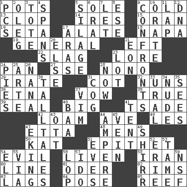 ACROSS 1. Plant holders 5. Not divided or shared with others 9. Chilled 13. Hoof sound 14. Angers 15. Northwest Algerian city 16. Stalk of a moss capsule 17. Having winglike extensions 18. California wine valley 19. Commissioned military rank 21. Lizard (obsolete) 22. Volcanic refuse 23. Old wives' tales, e.g. 24. Baking dish 27. Compass dir. 28. Words to Nanette 29. Feeling or showing extreme anger 31. Small bed 32. Religious women 36. Inactive volcano in Sicily 37. Solemn pledge 38. Loyal 39. Lick closed 40. Massive 41. Sadhe (variant) 42. Rich soil 44. "___ Maria" 46. French article 47. Singer James 48. Not women's 50. Krazy ___ of comics 51. Curse 54. Tending to cause great harm 56. Make or become more lively 58. SW Asia republic 60. Actor's bit 61. Baltic tributary 62. Basketball hoops 63. Falls behind 64. Introduce or present, as a question 65. Coral collection DOWN 1. Personal Computers (abbr.) 2. Cassini of fashion 3. Lug 4. Connects, as a bridge 5. Fodder prepared in a silo 6. Taken by mouth 7. Allow 8. Compass dir. 9. Meets 10. Declaim 11. Infant locale 12. Heredity factor (abbr.) 17. Ancient river in northeast Turkey 20. Otherwise 21. Period of immesurable duration 23. Car dealer's back yard 24. Sliced desserts 25. Johnson of "Laugh-In" 26. Nanny 28. Immediately 30. Baron Munchausen's specialties 31. Gear tooth 33. Mountain range 34. Unadorned 35. Observes 37. Zeal 40. Sound made by sheep 41. Portable shelter 43. Baseball player Mel 44. Electrical Unit 45. Distinctive style or manner 47. Supplementing with great effort 49. Bake eggs in their shells 51. Nights before holidays 52. 4th largest of the Great Lakes 53. Docile 54. Pipe bend 55. By way of 56. Chop off 57. Wedding promise 59. Science/research agcy.