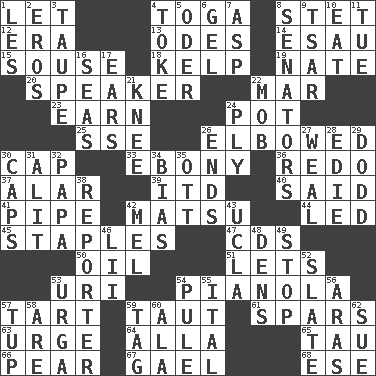 ACROSS 1. Allow 4. Ancient Roman robe 8. Proofreading order 12. Period 13. Lyric poems 14. Son of Isaac 15. Lush 18. Seaweed 19. Nathan's nickname 20. Orator 22. Spoil 23. Merit 24. Cooking vessel 25. Compass dir. 26. Shoved, as through a crowd 30. Head covering 33. Dark wood 36. Do over again 37. Having or resembling wings 39. It would 40. Expressed in words 41. Corncob 42. Taiwanese island in East China Sea 44. Directed 45. Paper fasteners 47. Music discs 50. Petroleum 51. Allows 53. RI univ. 54. Player piano 57. Small pie 59. Strained 61. Practice fights 63. Goad 64. Silent film actress Nazimova 65. The 19th letter of the Greek alphabet 66. Lightbulb-shaped fruit 67. Highlander 68. Compass dir. DOWN 1. French article 2. Greek god of love 3. Grayish beige 4. Casino tip 5. River in Europe 6. Set 7. Viper 8. Legislators 9. Russian ruler of old 10. Ingest 11. Third day of the wk. 16. Oceans 17. Hearing organs 21. Leg joint 22. Crowd into 24. Travel a route regularly 26. Extremities 27. Welt 28. Singer Brickell 29. Texas town _ City 30. Smile enhancers 31. Set down 32. Dad 34. Prejudice 35. Baseball player Mel 38. Newsperson 42. Cartoonist voice _ Blanc 43. Southern CA. univ. 46. Cards in a Roman deck? 48. Cub Scout units 49. Halt 52. Schedule 53. Capital and largest city of Mongolia 54. Whine 55. Slanted text style (abbr.) 56. Caspian sea tributary 57. Uncastrated adult male sheep 58. "We ___ not amused" (Victoria) 59. Label 60. According to 62. Institute legal proceedings