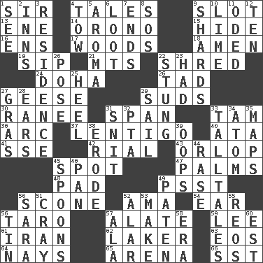 ACROSS 1. Title for a knight 4. Falsehoods 9. Position in a hierarchy or organization 13. Compass dir. 14. U. of Maine site 15. Flintstone garb 16. Followers of ems 17. Forest 18. So be it 19. Small drink 21. Mountains (abbr.) 22. Tear up 24. Capital of the state of Qatar 26. Small amount or degree 27. Honkers 29. Soap bubbles 30. The wife of a rajah (variant) 31. Connect, as a bridge 33. Scottish cap 36. Curve 37. Small, flat, pigmented spot on the skin 40. _ moment's notice (2 wds.) 41. Compass dir. 42. Monetary unit of Yemen 43. Fourth or lowest deck 45. Specific locale 47. Insides of hands 48. Writing tablet 49. Inconspicuous attention getter 50. Biscuitlike quick bread 52. Housemaid (var.) 54. Hearing organ 56. Pacific island yam 57. Having winglike extensions 59. Area sheltered from the wind 61. SW Asia republic 62. Member of a famous L.A. basketball team 63. Greek goddess of the dawn 64. Negative votes 65. Sports stadium 66. Fast jet (abbr.) DOWN 1. Perceive with the eye 2. Lodging establishments 3. Dwelling 4. Pull behind 5. Odor 6. Spoils 7. Conclusions 8. Distress signal 9. Broken pieces 10. Citrus frut 11. Wrote a lyric poem 12. "___ Little Indians" 20. Airs 22. Feeling sharp psychological pain 23. Possessed 25. Person who is morally reprehensible 27. Pate de foie ____ 28. Hearing organs 29. Move on water 31. In a ____ (agitated or irritated) 32. Parent Teacher Association (abbr.) 33. Baron Munchausen's specialties 34. Smallest unit of an element 35. Atlas contents 38. Eat (away) 39. I made a mistake 44. Raze (variant) 45. Soup utensils 46. Baking dish 49. Eucharist need 50. "Two Mules for Sister ____" 51. Supercomputer manufacturer 52. Having or resembling wings 53. Cause to be 55. Vintage cars 56. Shallow baking pan 57. Chicken ___ king 58. Period 60. Eastern Standard Time (abbr.)