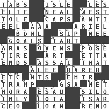 ACROSS 1. Bar bills 5. Small island 9. French article 12. Writer Wiesel 13. Anneal 14. Compass direction 15. Lacquered or enameled metalware 16. Balmoral and tarboosh 17. Opposed to 18. Snakelike fish 19. American Automobile Association (abbr.) 21. Satellite of Uranus 22. Soup holder 24. Small drink 26. Born 27. Finish lines 28. Small pie 29. Ancient river in northeast Turkey 30. Baking chambers 32. Introduce or present, as a question 36. Hoop that covers a wheel 37. Nonscientific branch of learning 38. Singer James 39. Extremities 40. Slender Brazilian palm 42. Not this but _ 43. Toward shelter 44. Less widely known 46. And so on (abbr.) 49. Mountains (abbr.) 50. Independent ruler or chieftain 51. _____ steamer (cargo ship) 53. Girls' org. (abbr.) 54. Dripping 57. Israeli folk dance 58. Son of Isaac 61. Grain storage tower 62. Inwardly 63. Globular water bottle used in Asia 64. Austrian river, tributary to the Danube 65. Corporate head (abbr.) 66. Rich soil 67. Former U.S. Attorney General Janet DOWN 1. Wig 2. _ vera 3. Big road sign 4. Perceive with the eye 5. South American Indian 6. Ocean 7. Pet locale 8. Raised railways 9. Soviet premier 1918-24 10. First name in cosmetics 11. Vertical member of a panel or frame 14. Armed conflict 19. Leather borer 20. In addition 21. Fitting 23. Fertile tracts in a desert 24. Before Barbara or Clara 25. Big collection agency 27. Broad smile 28. Laconic 29. Had dinner 31. Flower holders 32. _ dish (used to culture cells) 33. Else 34. Play the lead 35. Consume 40. The first octave above the treble staff 41. Angers 43. Electrical Unit 45. Nursemaid (var.) 46. Value system 47. Marketplace scale 48. Monte _, Las Vegas Hotel/Casino 52. Fifth month 53. Island territory of the United States 55. Flair 56. "Corrida" creature 58. Pipe bend 59. "Barney Miller" actor Jack 60. _ moment's notice (2 wds.) 61. Title for a knight