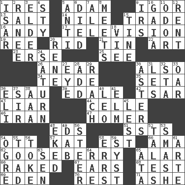 ACROSS 1. Angers 5. First man 9. Russian composer Stravinsky 13. Table seasoning 14. Mediterranean tributary 15. Barter 16. Actor Griffith 17. Household entertainment appliance 19. To riddle 20. To free from 21. Shallow baking pan 22. Tate display 23. Celtic language 25. Observe 26. Approach 30. In addition 34. Miss Universe 1986, Barbara Palacios _ 35. Bristle 36. He sold his birthright 39. Peak District village in England 42. Russian ruler of old 43. One who doesn't tell the truth 44. Cell (Danish) 46. SW Asia republic 47. Homing pigeon 48. Begley and Asner 51. Fast planes 54. Baseball player Mel 57. Krazy ___ of comics 58. Eastern Standard Time (abbr.) 60. Nursemaid (var.) 62. Sour, prickly fruit 65. Having or resembling wings 66. Moved through 67. Hearing organs 68. Trial 69. Locale of original sin 70. Remainder 71. American tennis player Robert DOWN 1. Austrian river, tributary to the Danube 2. The wife of a rajah (variant) 3. A person who is older than you are 4. Filthy place 5. Opposed to 6. Passed on 7. 100% 8. Confronts 9. Big collection agency 10. Greek goddess of the earth (variant) 11. Scent 12. Monthly bill 15. Prong on a fork 18. Compete 20. French philosopher Descartes 24. Titan orbits this 27. Sight organ 28. Find the sum of 29. Arrive at 30. Michaelmas daisies 31. French article 32. R.R. building 33. Rowing implement 36. Connecticut Ivy Leaguer 37. Title for a knight 38. American Automobile Association (abbr.) 40. Lion 41. Shade tree 45. For fear that 48. Made supply last 49. Pat or tap gently 50. Navigate 52. Falsehoods 53. Box-office sellout 54. Legendary monster 55. Frog relative 56. Puff or smoke 58. Blunders 59. System (abbr.) 61. Johnson of "Laugh-In" 63. Elected rep. 64. Actress Charlotte 65. _ moment's notice (2 wds.)