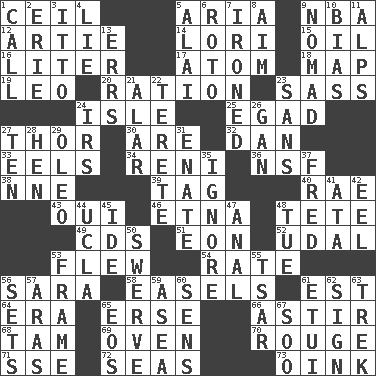 ACROSS 1. To provide with a ceiling 5. Roberta Peters solo 9. Basketball assoc. 12. Nick name for Arthur 14. Australian parrot (variant) 15. Petroleum 16. 61 cubic inches 17. Tiny particle 18. Atlas unit 19. Lion 20. Food allowance for one day 23. Backtalk 24. Small island 25. Mild oath 27. Son of Odin 30. "We ___ not amused" (Victoria) 32. One of the 12 tribes of Israel 33. Snakelike fish 34. Painter Guido (1575-1642) 36. Overdraft (abbr.) 38. Compass dir. 39. Label 40. Actress Charlotte 43. Fr. "Yes" 46. Inactive volcano in Sicily 48. False hair 49. Music discs 51. Period of immesurable duration 52. Hereditary estate 53. Soared 54. Pace 56. "Two Mules for Sister ____" 58. Artist's stands 61. Eastern Standard Time (abbr.) 64. Epoch 65. Celtic language 66. Moving or stirring 68. Scottish cap 69. Baking chamber 70. Makeup applied to the cheeks 71. Compass dir. 72. Oceans 73. Pig sound DOWN 1. Give a ring to 2. 4th largest of the Great Lakes 3. "Tell ____ the Marines!" 4. Falsehood 5. Mountain range southwest of Kyrgyzstan 6. Printing process, for short 7. Pressed 8. Direct toward a target or goal 9. Roamer 10. Prejudice 11. High mountains 13. Blunders 21. Having or resembling wings 22. Cigar-shaped 23. Without 24. Big collection agency 26. Separate the seeds from cotton 27. "___ Little Indians" 28. Layer 29. Margarine 31. Maternal 35. Snub 37. Flintstone 41. "One Day ___ Time" 42. Snakelike fish 44. Southern CA. univ. 45. Binary compound 47. Of or related to the anus 48. Third day of the wk. 50. Turn aside suddenly 53. Movie unit 55. Russian ruler of old 56. Puts into a specified state 57. Caspian sea tributary 59. Toward the sea 60. Elected reps. 61. Needle holder 62. Attach a signature 63. Long journey 65. Greek goddess of the dawn 67. "Barney Miller" actor Jack