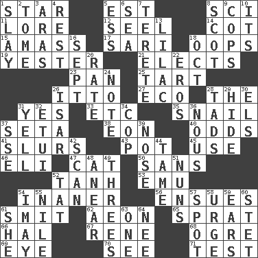 ACROSS 1. Play the lead 5. Eastern Standard Time (abbr.) 8. _-fi 11. Old wives' tales, e.g. 12. Sew up the eyelids of hawks and falcons 14. Small bed 15. Collect or gather 17. Indian skirt 18. I made a mistake 19. Of or pertaining to yesterday 21. Chooses 23. Baking dish 25. Small pie 26. "Tell ____ the Marines!" 27. Environmental prefix 28. Definite Article 31. It is so 33. And so on (abbr.) 35. Slow-paced one 37. Stalk of a moss capsule 38. A really long time 40. Likelihood 41. Runs notes together 43. Cooking vessel 45. Purpose 46. Biblical high priest 47. Feline 50. Without 52. Hyperbolic tangent 53. Australian flightless bird 54. Sillier 56. Takes place subsequently 61. Stricken, poetically 62. Period of immesurable duration 65. Small fatty European fish 66. Actor Linden 67. French philosopher Descartes 68. Legendary monster 69. Sight organ 70. Perceive with the eye 71. Trial DOWN 1. Kill 2. Heavy book 3. Ancient river in northeast Turkey 4. Respite 5. Double-curved letter 6. Ocean 7. Cylindrical with tapered ends 8. Native of Scotland 9. 911 reaches them 10. It is 13. Pale purple color 16. Back-to-school mo. 18. Sep. follower 20. Pace 22. Greek god of love 24. Short letter 26. Austrian river, tributary to the Danube 28. Small boys 29. Flintstone garb 30. Raised railways 31. Shout 32. Needle case 34. Police officer (slang) 36. Common sense 37. Compass dir. 39. Characteristic smell of wine 42. Skim 44. Not wild 48. Approach 49. Threesomes 51. Religious women 52. Make lace 54. "If ____ say so..." 55. "Death on the ____" 57. Specific locale 58. Goad 59. Hearing organs 60. Proofreading order 61. A female animal or person 63. Single 64. Born
