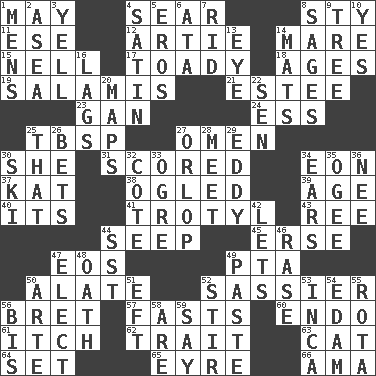 ACROSS 1. Fifth month 4. Burn superficially 8. Filthy place 11. Compass dir. 12. Nick name for Arthur 14. Female horse 15. 1994 drama film starring Jodie Foster 17. Sycophant 18. Grows older 19. Deli grouping 21. First name in cosmetics 23. Separate the seeds from cotton 24. Curvy letter 25. Cook's measure (abbr.) 27. Sign of something about to happen 30. A female animal or person 31. Tallied 34. A really long time 37. Krazy ___ of comics 38. Stared at amorously 39. Grow older 40. It is 41. Trinitrotoluene 43. To separate or throw off 44. Ooze 45. Celtic language 47. Greek goddess of the dawn 49. Parent Teacher Assoc. 50. Having winglike extensions 52. More disrespectful 56. Cy Young winner Saberhagen 57. Goes without food and/or water 60. Inside; within (prefix) 61. Hankering 62. Distinguishing feature 63. Feline 64. Arrange properly for use 65. Jane of fiction 66. Nursemaid (var.) DOWN 1. Not women's 2. Toward the sea 3. Shout 4. Smooth fabric 5. Greek god of love 6. "One Day ___ Time" 7. To free from 8. Gurus 9. Woody plant 10. Affirmative reply 13. Sight organ 14. Floor coverings 16. Fails to keep up a pace 20. Atlas contents 22. Elected rep. 25. Not this but _ 26. Antes 27. Lowest deck of a ship 28. Rendezvous 29. Whirlpool 30. What Jean-Claude Killy likes to do 32. ____ d'Azur (French Riviera) 33. Legendary monster 34. Hearing organs 35. Double curve, resembling the letter S 36. Born 42. Allows 44. Fast jet (abbr.) 46. To erase 47. Voters do this 48. Pledge 49. Thick mixture 50. Johnson of "Laugh-In" 51. Lizard (obsolete) 52. Move through with a circular motion 53. South American Indian 54. Dutch treat 55. Round or rotation of duties 56. Twice 58. "We ___ not amused" (Victoria) 59. Declare