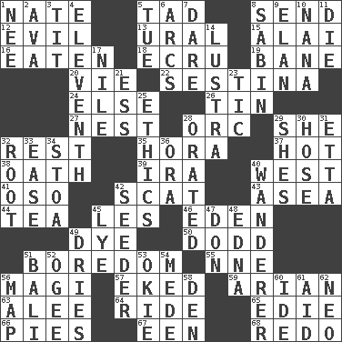 ACROSS 1. Nathan's nickname 5. Small amount or degree 8. Transmit 12. Morally bad or wrong 13. Mountain range 15. Mountain range southwest of Kyrgyzstan 16. Ingested 18. Shade of tan 19. Object of repulsion 20. Compete 22. French poetic form 24. Otherwise 26. Shallow baking pan 27. A home for chicks 28. The grampus (Milton) 29. A female animal or person 32. State of inaction 35. Israeli folk dance 37. Being at a high temperature 38. Pledge 39. Retirement account (abbr.) 40. 270 degrees 41. Bear (Spanish) 42. Leave at once 43. Toward the sea 44. Beverage made from leaves 45. French article 46. Locale of original sin 49. Color 50. Texas town _ City 51. Mood resulting from idleness 55. Compass dir. 56. Wise men 57. Supplemented with great effort 59. Believer in; advocate of (suffix) 63. Toward shelter 64. Travel on an animal 65. Singer Brickell 66. Sliced desserts 67. Car or cant ending 68. Redecorate DOWN 1. Born 2. Actress Gardner 3. Teat (slang) 4. Veterans Day date 5. Third day of the wk. 6. Curves 7. Have the gumption 8. Unit of acoustic absorption 9. Style 10. Grandmother 11. Pass on 14. A period of five years 17. Mediterranean tributary 21. Double-curved letter 23. Nervous spasm 25. Value system 28. Spoke pompously 29. "______ My Girl" (Turtles hit) 30. Flexible conduit 31. Singer James 32. Carrot, for example 33. Relaxation 34. Portico 36. Mouth or opening 40. Roamer 42. Sowing specialist 45. Potassium hydroxide 47. Spanish title 48. Pulitzer Prize-winning author Ferber 49. Frees from moisture 51. Indonesian resort city 52. Double curve, resembling the letter S 53. Migrant worker of the '30s 54. Ancient Persian 56. Atlas unit 58. Lair 60. Binary compound 61. Help 62. Modern: prefix