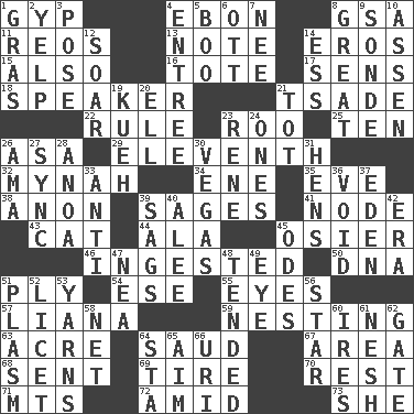 ACROSS 1. Con 4. Inky black, to poets 8. Girls' org. (abbr.) 11. Vintage cars 13. Observe 14. Greek god of love 15. In addition 16. Carry 17. Elected reps. 18. Orator 21. Sadhe (variant) 22. Governing power 23. Friend of Pooh 25. Nine, plus one 26. White ___ sheet 29. Veterans Day date 32. Non-adult bird? 34. Compass dir. 35. Night before a holiday 38. At once, immediately (arch.) 39. Gurus 41. Connecting point 43. Feline 44. In the manner of 45. Flexible twig of a willow tree 46. Eaten 50. Heredity factor (abbr.) 51. Apply oneself diligently 54. Compass dir. 55. Sight organs 57. Climbing, woody, usually tropical vines 59. Snuggling 63. Measure of real estate 64. Saudi Arabian king (1953-1964) 67. Length times width 68. Transmitted 69. Hoop that covers a wheel 70. Repose 71. Mountains (abbr.) 72. Among 73. A female animal or person DOWN 1. Pate de foie ____ 2. Sharp bark 3. Airs 4. Main course 5. Surprise greeting 6. Baseball player Mel 7. Born 8. Relatively large 9. Message 10. NE Netherlands city 12. Fly high 14. Double-curved letter 19. Malaysian steamed pastry 20. Pipe bend 21. Small child 23. French philosopher Descartes 24. Washington bills 26. Nursemaid (var.) 27. Synchronize (abbr.) 28. Small Philippine buffalo 30. Viva Las _ 31. Coop moms 33. Opposed to 36. Nothingness 37. Locale of original sin 39. Sinks 40. Toward shelter 42. Epoch 45. Lyric poems 47. Teachers' org. 48. Watched over 49. Sight organ 51. Suffix with ecto or cyto 52. It is permitted: Lat. 53. Tall tales 56. Play the lead 58. Fish or hair follower 60. Angers 61. Soft 62. Yard entry 64. R.R. building 65. Direct toward a target or goal 66. RI univ.