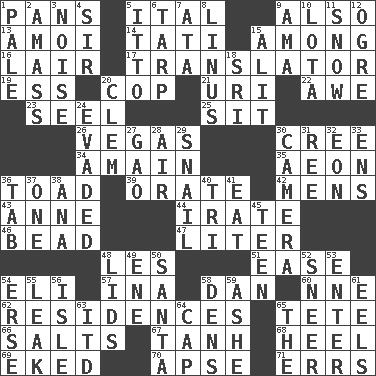 ACROSS 1. Zero-star reviews 5. Slanted text style (abbr.) 9. In addition 13. Mine, in Marseilles 14. Jacques of French films 15. Amid 16. Den 17. Interpreter 19. Curvy letter 20. Police officer (slang) 21. RI univ. 22. Deep reverence 23. Stitch closed the eyes of (a falcon) 25. Be seated 26. Viva Las _ 30. Algonquian 34. At full speed 35. A really long time 36. Frog relative 39. Declaim 42. Not women's 43. Singer Murray 44. Feeling or showing extreme anger 46. Necklace unit 47. 61 cubic inches 48. French article 51. Relaxation 54. Connecticut Ivy Leaguer 57. _ tizzy (2 wds.) 58. One of the 12 tribes of Israel 60. Compass dir. 62. Homes 65. Wig 66. Table seasonings 67. Hyperbolic tangent 68. The bottom of a shoe or boot 69. Supplemented with great effort 70. Domed church section 71. Blunders DOWN 1. Diluted with white 2. Collect or gather 3. Annoying sound 4. Title for a knight 5. "Tell ____ the Marines!" 6. Canvas cover 7. "One Day ___ Time" 8. "_ and Lucy" (Charlie Brown theme song) 9. Nanny (var.) 10. Globular water bottle used in Asia 11. Frozen precipitation 12. Legendary monster 15. Came down and settled, as after flight 18. Indian title of respect (Mr.) 20. Clement's nick name 24. Eluded 27. E Mali city 28. Atmosphere 29. Slow-paced one 30. Device for capturing images 31. To separate or throw off 32. Period of immesurable duration 33. Followers of ems 36. Bar bill 37. Single 38. Santa ___, CA 40. Three (prefix) 41. Consume 45. Adolescent 48. Hats (slang) 49. Compass dir. 50. Before Barbara or Clara 52. Scornful expression 53. Keyboard key 54. Celtic language 55. Path through which fluid escapes 56. Small island 58. Hiding places for outlaws 59. American tennis player Robert 61. Snakelike fish 63. It would 64. Head covering 65. Definite Article