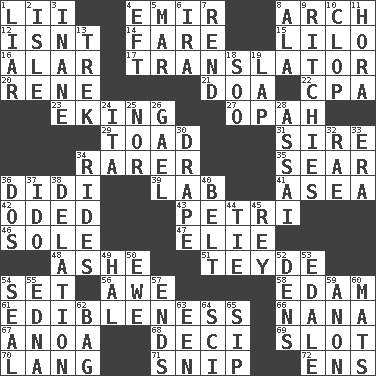 ACROSS 1. Cards in a Roman deck? 4. Arab leader 8. Bowlike part 12. Is not 14. Conductor's collection 15. _ and Stitch 16. Having or resembling wings 17. Interpreter 20. French philosopher Descartes 21. ___ good deed 22. Tax preparer (abbr.) 23. Supplementing with great effort 27. Brightly colored fish 29. Frog relative 31. Male parent of an animal 34. More valued for its uncommonness 35. Shrivel 36. "You Light Up My Life" star Conn 39. Experiment locale 41. At sea 42. Wrote a lyric poem 43. _ dish (used to culture cells) 46. Not divided or shared with others 47. Writer Wiesel 48. American tennis player Robert 51. Miss Universe 1986, Barbara Palacios _ 54. Arrange properly for use 56. Deep reverence 58. Dutch treat 61. The property of being fit to eat 66. Grandmother 67. Small Philippine buffalo 68. Tenth: prefix 69. Narrow, elongated depression 70. Austrian-born American filmmaker Fritz 71. Clip 72. Followers of ems DOWN 1. One who doesn't tell the truth 2. Capri or Wight 3. Empty; void 4. Newt 5. Third mo. 6. Lyricist Gershwin 7. Tear apart 8. Insect wing 9. Actors Guy, Robert Welles, and Clint 10. Hoof sound 11. Israeli folk dance 13. Long journey 18. "Barney Miller" actor Jack 19. Infant locale 24. Call ___ day 25. Not either 26. Highlander 28. Slender Brazilian palm 30. Window treatment 32. Actress Charlotte 33. Period 34. Amusement-park features 36. Two (Sp.) 37. Wedding promise 38. Accusation by an informer 40. Waist strap 44. Make a knot 45. Marina Del _, California 49. Actor Linden 50. She-sheep 52. Cub Scout units 53. Peak District village in England 54. Lick closed 55. Pulitzer Prize-winning author Ferber 57. Conclusions 59. At once, immediately (arch.) 60. Floor protectors 62. Paper or plastic container 63. Car or cant ending 64. _-fi 65. Small drink