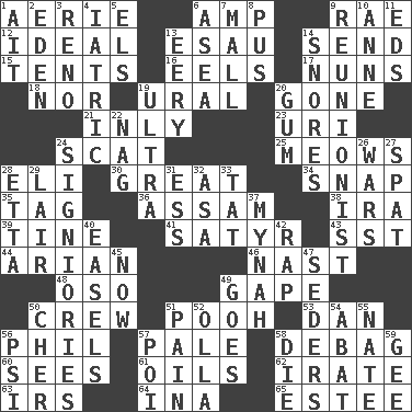 ACROSS 1. Nest on high 6. Electrical Unit 9. Actress Charlotte 12. Perfect 13. He sold his birthright 14. Transmit 15. Portable shelters 16. Snakelike fish 17. Religious women 18. Not either 19. Mountain range 20. Went 21. Inwardly 23. RI univ. 24. Go away! 25. Catcalls? 28. Biblical high priest 30. Relatively large 34. Fastener 35. Label 36. Indian state 38. Lyricist Gershwin 39. Prong on a fork 41. Letch 43. Fast jet (abbr.) 44. Believer in; advocate of (suffix) 46. Political cartoonist Thomas 48. Bear (Spanish) 49. Stare wonderingly 50. Group working together 51. "Silly old bear" 53. One of the 12 tribes of Israel 56. Silvers or Donahue 57. Diluted with white 58. Debunk (Brit. slang) 60. Observes 61. Petroleums 62. Feeling or showing extreme anger 63. Big collection agency 64. _ tizzy (2 wds.) 65. First name in cosmetics DOWN 1. Small island 2. Locale of original sin 3. Former U.S. Attorney General Janet 4. Of or pertaining to medicine 5. Raised railways 6. At sea 7. Shopping center 8. Product of festering 9. One who advocates reunion 10. Singer Murray 11. Begley and Asner 13. Suggestive of the supernatural 14. Sounds asleep 19. Extremist 20. Chewing product 22. Tired old horse 24. Seigniories (variant) 26. Armed conflicts 27. Argument over a trivial matter 28. Singer James 29. Den 31. Curvy letter 32. White ___ sheet 33. Make lace 37. Non-adult bird? 40. Artist's stands 42. Hit sharply and swiftly 45. At this time 47. Spring feasts 49. Leaves 50. "Mermaids" star 51. Ache 52. Water jar 54. Blind as ____ 55. Nathan's nickname 56. Air pressure measure (abbr.) 57. Luau course 58. Expire 59. Turn to the right