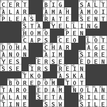 ACROSS 1. Sure thing 5. Massive 8. Table seasoning 12. Having or resembling wings 13. Wet nurse 15. Mine, in Marseilles 16. Entreaties 18. Pace 19. Emitted 20. R.R. building 22. Crying or shouting loudly 24. Same (prefix) 26. Writing instrument 27. Smile enhancers 28. Corporate head (abbr.) 29. Car dealer's back yard 32. Capital of the state of Qatar 35. Burn to charcoal 37. Ripen 38. Soon (poet.) 39. Direct toward a target or goal 40. Beget 41. Affirmative reply 42. Celtic language 43. Paradise 44. Compass dir. 45. Big collection agency 46. It's straight from the horse's mouth 49. Ring climax 50. "____ silly question..." 51. Mood resulting from idleness 55. Small child 56. Pacific island yam 57. Dutch treat 59. Pitcher Ryan 63. Actor Alda or Thicke 64. Stalk of a moss capsule 65. Cause heat under the collar 66. Prong on a fork 67. Compass dir. 68. Drop; flow; fall DOWN 1. Head covering 2. Pipe bend 3. Actress Charlotte 4. File 13 5. Long, evenly shaped piece 6. "If ____ say so..." 7. Yard entry 8. Indian antelope 9. So be it 10. Yearn 11. Teat (slang) 14. Assistant 17. Portico 21. Electrical Unit 23. Lion 25. Motion picture awards 28. Device for capturing images 29. Put down 30. Legendary monster 31. Adolescent 32. 24-hour periods 33. Singles 34. Stockings 36. Part of HMS, perhaps 40. Elected representatives 42. Eats (away) 45. Mamie's husband 47. Eastern Standard Time (abbr.) 48. Picture 49. Marketplace scale 51. Indonesian resort city 52. Northwest Algerian city 53. Lyric poems 54. Floor coverings 56. Make lace 58. Opening into something insatiable 60. Cards in a Roman deck? 61. 100% 62. Born