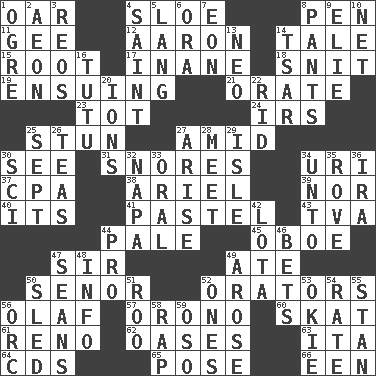 ACROSS 1. Rowing implement 4. A type of plum 8. Fenced enclosure 11. Turn to the right 12. Composer Copland 14. Falsehood 15. Carrot, for example 17. Empty; void 18. In a ____ (agitated or irritated) 19. Taking place subsequently 21. Speak pompously 23. Small child 24. Big collection agency 25. Astound 27. Among 30. Observe 31. Sounds asleep 34. RI univ. 37. Tax preparer (abbr.) 38. Satellite of Uranus 39. And not 40. ___ a Wonderful Life 41. Soft color 43. Federal power corp. 44. Light colored 45. Mitch Miller's instrument 47. Title for a knight 49. Had dinner 50. Sir (Sp.) 52. Speakers 56. Norwegian king 57. U. of Maine site 60. Three-handed card game 61. Former U.S. Attorney General Janet 62. Fertile tracts in a desert 63. Call ___ day 64. Music discs 65. Airs 66. Car or cant ending DOWN 1. Legendary monster 2. Period of immesurable duration 3. Vintage cars 4. Inhabitant of Heaven 5. Long (Scottish) 6. Mouth or opening 7. Period of immesurable duration 8. Leg coverings 9. Writer Wiesel 10. Remaining after all deductions 13. Modern: prefix 14. Russian ruler of old 16. Ballerina skirt 20. Charged atoms 22. To free from 25. Back-to-school mo. 26. Afternoon social gatherings 27. Get up 28. Rendezvous 29. Small island 30. _-fi 32. California wine valley 33. Spoken 34. To (old English) 35. Be footloose 36. Retirement account (abbr.) 42. Globular water bottle used in Asia 44. Adept person 46. Stakes 47. Seines 48. A message received and understood 49. Came up 50. Downhill vehicle 51. Friend of Pooh 52. Singles 53. Migrant worker of the '30s 54. Pace 55. Comedian Laurel of Laurel & Hardy 56. The grampus (Milton) 58. Hit sharply and swiftly 59. Bear (Spanish)