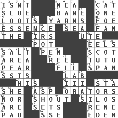 ACROSS 1. Is not 5. Teachers' org. 8. Domesticated feline 11. A type of plum 12. Object of repulsion 14. Single 15. Plunders 17. Tall tales 18. Enemy 19. Gist 21. Ocean 22. Avid follower 23. Definite Article 24. Big collection agency 25. Shoshoni 27. Plant holder 28. Snakelike fish 31. Table seasoning 35. Fenced enclosure 37. Highlander 38. Type of rug 39. Portuguese money of account (variant) 41. Ballerina skirt 42. Lightbulb-shaped fruit 43. Pipe bend 45. Connect, as a bridge 46. Fast planes 47. Experiment locale 49. Part of HMS, perhaps 51. One more than two 52. R.R. building 55. A female animal or person 57. Cleo's killer 60. Speakers 62. And not 63. Yell 65. Grain storage towers 66. "We ___ not amused" (Victoria) 67. Puts into a specified state 68. French philosopher Descartes 69. Writing tablet 70. Compass dir. 71. Locale of original sin DOWN 1. Small island 2. Agitate, as a liquid 3. Trap for birds or small mammals 4. False hair 5. Basketball assoc. 6. Hearing organs 7. Queen of England 1702-14 8. Java holder (2 wds.) 9. Small Philippine buffalo 10. Adolescent 13. He sold his birthright 16. Sever or remove by pinching or nipping 17. Of or pertaining to yesterday 20. Riding implement 26. Trials 29. Globular water bottle used in Asia 30. Surprise greatly 31. Plant excrements 32. Ancient Greek god of war 33. Resembling or made to resemble leather 34. Tarsus (plural) 36. Born 40. American author Paul (1891-1958) 44. Den 48. Prejudice 50. Backtalk 52. Having a sole or soles 53. Heavy duty weighing machine 54. NE Netherlands city 55. Fastener 56. Israeli folk dance 58. "______ My Girl" (Turtles hit) 59. Plant holders 61. Become fatigued 64. Purpose
