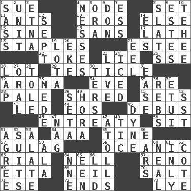ACROSS 1. Institute legal proceedings 4. Method 8. Put into a specified state 11. Pismires 13. Greek god of love 14. Otherwise 15. Trig term 16. Without 17. Thin strip of wood or metal 18. Paper fasteners 21. First name in cosmetics 22. Casino tip 23. Untruth 25. Compass dir. 26. Car dealer's back yard 29. One of the two male reproductive glands 32. Odor 34. First lady 35. "We ___ not amused" (Victoria) 38. Diluted with white 39. Tear up 41. Puts into a specified state 43. Directed 44. Greek goddess of the dawn 45. Alight from a bus 46. Plea 50. Be seated 51. White ___ sheet 54. Auto club (abbr.) 55. Prong on a fork 57. POW camp 59. Pertaining to the sea 63. Monetary unit of Yemen 64. 1994 drama film starring Jodie Foster 67. Former U.S. Attorney General Janet 68. Singer James 69. Famous astronaut Armstrong 70. Table seasoning 71. Compass dir. 72. Conclusions 73. Potassium hydroxide DOWN 1. Backtalk 2. A single undivided whole 3. Inactive volcano in Sicily 4. Makes clutter 5. Mouth or opening 6. Spanish title 7. Double-curved letter 8. Narrow boards 9. _____ Park, CO 10. Giggle 12. Back-to-school mo. 14. Raised railways 19. Globular water bottle used in Asia 20. Supplement with great effort 21. Snakelike fish 23. Not recorded 24. On the rocks 26. Infant locale 27. Of the mouth 28. Lacquered or enameled metalware 30. Laconic 31. Relaxation 33. Ancient Persian 36. Confederate soldiers (slang) 37. Needle holder 39. Stalk of a moss capsule 40. Israeli folk dance 42. Fast jet (abbr.) 45. Unit of force 47. Tired old horse 48. Ringlike coral islands and reefs 49. Nervous spasm 51. Match 52. Costumes for special activities 53. Having winglike extensions 56. Hearing organs 58. Wing 60. Anneal 61. In an inward manner 62. ____ d'Azur (French Riviera) 64. Compass dir. 65. Car or cant ending 66. Hat (slang)