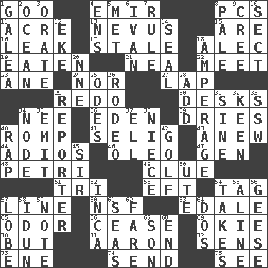 ACROSS 1. Thick or sticky substance 4. Arab leader 8. Personal Computers (abbr.) 11. Land measure 13. Congenital growth or mark on the skin 15. "We ___ not amused" (Victoria) 16. Path through which fluid escapes 17. Having lost freshness 18. Actor Baldwin 19. Eroded 21. Teachers' org. 22. Confront 23. A saturated hydrocarbon 24. And not 27. Pet locale 29. Redecorate 30. Writing tables 34. Born 36. Locale of original sin 39. Frees from moisture 40. Play 41. Major League Baseball Commissioner Bud 43. Afresh 44. Goodbye (Sp.) 46. Margarine 47. Commissioned mil. rank 48. _ dish (used to culture cells) 49. A slight indication 51. Three (prefix) 53. Lizard (obsolete) 54. Label 57. Actor's bit 60. Overdraft (abbr.) 63. Peak District village in England 65. Scent 66. Stop 69. Migrant worker of the '30s 70. Yet 71. Composer Copland 72. Elected reps. 73. Compass dir. 74. Post 75. Perceive with the eye DOWN 1. An organ shaped like a helmet 2. Sea 3. Speak pompously 4. Followers of ems 5. Was introduced to 6. _ the terrible 7. General guideline 8. Light colored 9. Algonquian 10. Religious group 12. Supplement with great effort 14. Lick closed 18. Electrical Measurement 20. Compass dir. 25. Lyric poems 26. Cowboy competition 28. Find the sum of 29. Newsperson 31. Trig term 32. Peachy ____! 33. Compass dir. 34. Connecting point 35. Give off 37. Pipe bend 38. Sibling's daughter 40. Strike 42. _ course 45. Title for a knight 50. Shoshoni 52. South American Indian 54. Proceeds 55. Place in a line 56. Honkers 57. Ear part 58. Goddess of spring and wife of Bragi 59. Observe 61. Oceans 62. Conductor's collection 64. Two (Sp.) 67. Boy, to dad 68. Conclusion