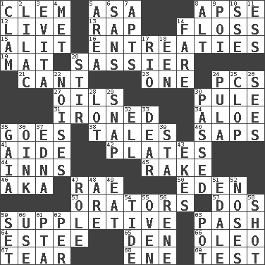 ACROSS 1. Clement's nick name 5. White ___ sheet 8. Domed church section 12. Not recorded 13. Reproach for some lapse or misdeed 14. Soft thread for cleaning between teeth 15. Came down and settled, as after flight 16. Pleas 19. Floor covering 20. More lively and spirited 21. Patter 23. Single 24. Personal Computers (abbr.) 27. Petroleums 30. Whine 31. Pressed 34. Medicinal plant 35. Moves 38. Falsehoods 40. Plant excrements 41. Helper 42. Food holders 44. Taverns 45. Immoral or dissolute person 46. Alias (abbr.) 47. Actress Charlotte 50. Paradise 53. Speakers 57. Two (Sp.) 59. Supplying deficiencies 63. Romantic infatuation 64. First name in cosmetics 65. Lair 66. Margarine 67. Pull apart 68. Compass dir. 69. Trial DOWN 1. Burrowing marine mollusk 2. Pale purple color 3. Webber/Rice musical 4. Was introduced to 5. Length times width 6. Without 7. Tenement units (abbr.) 8. Keyboard modifier key 9. Luau course 10. Compass dir. 11. Curvy letter 14. Conductor's collection 17. River (Sp.) 18. Car or cant ending 20. Commotion 22. Annoying sounds 24. Monetary unit of Botswana 25. Hoof sound 26. Perceives with the eye 28. Car dealer's back yard 29. Fastener 30. Went by 32. Pipe bend 33. Letter starter 35. Greek goddess of the earth (variant) 36. Pig sound 37. Pulitzer Prize-winning author Ferber 39. R.R. building 43. Makes supply last 47. Hero or heavy, e.g. 48. "We ___ not amused" (Victoria) 49. Erode 51. Peak District village in England 52. Olfactory organs 54. Periodic rise and fall of the sea level 55. Baking chamber 56. French philosopher Descartes 58. Attempt 59. Arrange properly for use 60. Purpose 61. Parent Teacher Association (abbr.) 62. For each 63. Cooking vessel