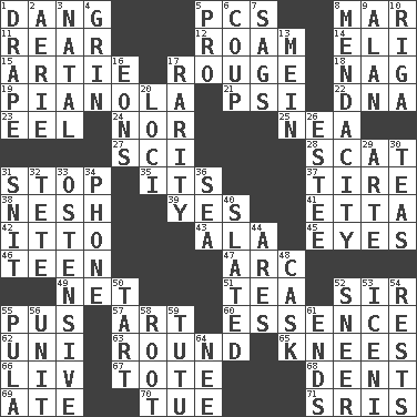 ACROSS 1. Mild oath, euphamism for damn 5. Personal Computers (abbr.) 8. Make imperfect 11. Hitchcock's "____ Window" 12. Wander 14. Connecticut Ivy Leaguer 15. Nick name for Arthur 17. Makeup applied to the cheeks 18. Tired old horse 19. Player piano 21. 23rd letter of the Greek alphabet 22. Heredity factor (abbr.) 23. Snakelike fish 24. Not either 25. Teachers' org. 27. _-fi 28. Get outta here! 31. Cease 35. It is 37. Hoop that covers a wheel 38. Soft 39. It is so 41. Singer James 42. "Tell ____ the Marines!" 43. According to 45. Snake ____ (dice throw) 46. Adolescent 47. Curve 49. Fish or hair follower 51. Afternoon social gathering 52. Title for a knight 55. Fluid product of inflammation 57. Nonscientific branch of learning 60. Center 62. Corn or form start 63. Unit of ammunition 65. Leg joints 66. 54 in ancient Rome 67. Lug 68. Gouge 69. Had dinner 70. Third day of the wk. 71. Indian titles of respect DOWN 1. Window treatment 2. Nest on high 3. Relating to or accompanying birth 4. Smile widely 5. Adept person 6. Overturn; upset 7. Sinks 8. Ananias' fault 9. Actor Alda or Thicke 10. Capital of Latvia 13. Chow _ 16. Immeasurably long periods of time 17. Noteworthy scarcity 20. Locales 26. First name in cosmetics 29. Johnson of "Laugh-In" 30. Beverages made from leaves 31. In a ____ (agitated or irritated) 32. Wig 33. Clearly or manifestly demonstrative 34. Give a jingle 36. Ocean 40. Scheduled 44. Ancient Greek god of war 48. Keg 50. Small pie 52. Scornful expression 53. Ancient Celtic tribe of eastern Britain 54. Musical pauses 55. Monetary unit of Botswana 56. A single undivided whole 58. Carrot, for example 59. Ballerina skirt 61. Conclusions 64. Born