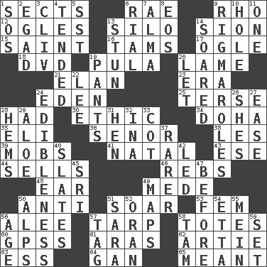 ACROSS 1. Religious groups 6. Actress Charlotte 9. 17th letter of the Greek alphabet 12. Stares at amorously 13. Grain storage tower 14. The Jewish people; Israel 15. Inhabitant of Heaven 16. Scottish caps 17. Stare at amorously 18. Movie disc 19. Monetary unit of Botswana 20. Unable to walk 21. Liveliness 23. Epoch 24. Locale of original sin 25. Laconic 28. Possessed 30. Principle of right and wrong 34. Capital of the state of Qatar 35. Biblical high priest 36. Sir (Sp.) 38. French article 39. Disorderly crowds 41. Relating to or accompanying birth 43. Compass dir. 44. Exchanges for money 46. Confederate soldiers (slang) 48. Ewer handle 49. Ancient Persian 50. Against 51. Fly high 53. Opposite of masc. 56. Toward shelter 57. Canvas cover 58. Hauls 60. Global Positioning Systems (abbr.) 61. Caspian sea tributary 62. Nick name for Arthur 63. Curvy letter 64. Separate the seeds from cotton 65. Intended DOWN 1. Distress signal 2. Mild oath 3. 154 in Roman numerals 4. Watched over 5. Fast jet (abbr.) 6. Monetary unit of Yemen 7. _ mater 8. Greek goddess of the dawn 9. Frustrating wastes of time 10. Hollow 11. Single 13. Astound 14. Flew 19. Leg coverings 20. Allow 22. Area sheltered from the wind 24. The property of being fit to eat 26. "______ My Girl" (Turtles hit) 27. Comfort 28. Cloth borders 29. Medicinal plant 31. Layer 32. _ tizzy (2 wds.) 33. Small bed 37. Less widely known 40. Chalkboards 42. Directed 45. Indian title of respect (Mr.) 47. Prior to 49. Atlas contents 50. High mountains 51. "Two Mules for Sister ____" 52. Northwest Algerian city 54. Singer James 55. Chow _ 56. Mature 57. Label 58. Scottish cap 59. Put into a specified state
