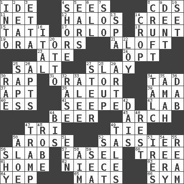 ACROSS 1. Binary compound 4. Observes 8. Music discs 11. Remaining after all deductions 12. Saint headwear 14. Algonquian 15. Jacques of French films 17. Lowest deck of a ship 18. Undersized animal 19. Speakers 21. High up in or into the air 23. Had dinner 24. Choose 25. Table seasoning 27. Kill 30. Strike 31. Speaker 34. Small boy 37. Fitting 38. Native American of Southwest Alaska 39. Nanny (var.) 40. Double-curved letter 41. Oozed 43. Experiment locale 44. Fermented drink made from hops 45. Bowlike part 47. Three (prefix) 49. Neckwear 50. Came up 52. More impudent 56. Thick slice 57. Artist's stand 60. Woody plant 61. Dwelling 62. Sibling's daughter 63. Period 64. Slangy assent 65. Floor coverings 66. Symbol (abbr.) DOWN 1. To the inside or interior of 2. Letter starter 3. Singer James 4. Dinah or Pauly 5. Hearing organs 6. Pipe bend 7. "Barney Miller" actor Jack 8. An unpleasant substance 9. Gouge 10. Put into a specified state 13. Health resort 14. Riding implement 16. Slanted text style (abbr.) 20. Von Bismarck 22. Myrna of the movies 25. Plant excrements 26. Flats, for short 27. Navigate 28. Central Nebraska county 29. Johnson of "Laugh-In" 30. Actress Charlotte 32. To erase 33. Toward shelter 34. Baby powder 35. Nanny 36. Apply (a substance) by light strokes 42. Raised platform 44. Again 46. Take ten 47. _____ steamer (cargo ship) 48. Loose flowing garment 49. Falsehoods 50. _ vera 51. Car or cant ending 52. Religious group 53. Angers 54. Suggestive of the supernatural 55. 480, 500 or 516 sheets of paper 56. Like a shrinking violet 58. Direct toward a target or goal 59. Ocean