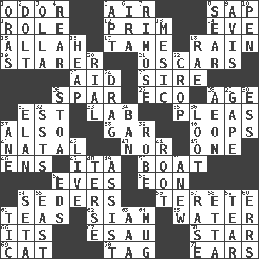 ACROSS 1. Aroma 5. Wind 8. Plant excrement 11. Hero or heavy, e.g. 12. Demure 14. First lady 15. Assad's deity 17. Not wild 18. Water falling in drops from the sky 19. A viewer who gazes fixedly 21. Motion picture awards 23. Help 25. Beget 26. Coast Guard woman 27. Environmental prefix 28. Grow older 31. Eastern Standard Time (abbr.) 33. Experiment locale 35. Entreaties 37. In addition 38. Slender fish 40. I made a mistake 41. Relating to or accompanying birth 43. Not either 45. Single 46. Followers of ems 47. Call ___ day 50. Water vessel 52. Nights before holidays 53. A really long time 54. Spring feasts 56. Cigar-shaped 61. Beverages made from leaves 62. Thailand, formerly 65. Wetness 66. It is 67. He sold his birthright 68. Play the lead 69. Domesticated feline 70. Label 71. Hearing organs DOWN 1. Mouths or openings 2. Dunce 3. Spanish pot 4. Hitchcock's "____ Window" 5. Fitting 6. Lyricist Gershwin 7. Full of chinks, cracks, or crevices 8. Shrivel 9. Advice 10. Fenced enclosure 13. Mesonic 16. Pile 18. Actress Charlotte 20. Monetary unit of Yemen 22. Riding implement 24. To draw with force 26. Portico 28. Period of immesurable duration 29. Open wide 30. Curvy letter 31. Enthusiasm 32. Fast planes 34. Forbid 36. Spoils 37. A saturated hydrocarbon 39. Loose flowing garment 42. Not recorded 44. Carrot, for example 48. Laconic 49. Aid 51. Afresh 52. Begley and Asner 54. Bristle 55. 90 degrees 57. To erase 58. Singer James 59. Separate forcefully 60. Blunders 61. Nervous spasm 63. Auto club (abbr.) 64. Java container