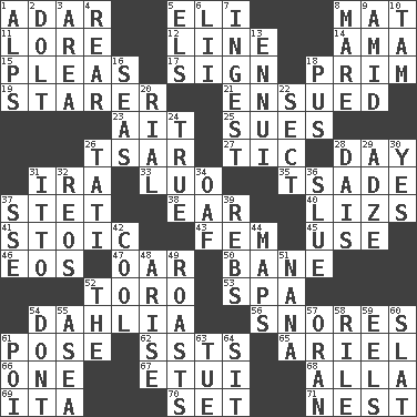 ACROSS 1. The sixth month of the Jewish calendar 5. Biblical high priest 8. Floor covering 11. Old wives' tales, e.g. 12. Actor's bit 14. Wet nurse (var.) 15. Entreaties 17. Signal 18. Demure 19. A viewer who gazes fixedly 21. Took place subsequently 23. Small island 25. Institutes legal proceedings 26. Russian ruler of old 27. Nervous spasm 28. 24 hours 31. Lyricist Gershwin 33. Nilotic language 35. Sadhe (variant) 37. Proofreading order 38. Ewer handle 40. Belonging to Elizabeth 41. Unemotional 43. Opposite of masc. 45. Purpose 46. Greek goddess of the dawn 47. Boat paddle 50. Object of repulsion 52. "Corrida" creature 53. Health resort 54. A pale violet or amethyst color 56. Sounds asleep 61. Airs 62. Fast planes 65. Satellite of Uranus 66. Single 67. Needle case 68. Silent film actress Nazimova 69. Call ___ day 70. Put into a specified state 71. Egg locale DOWN 1. High mountains 2. Dunce 3. Type of rug 4. Bring up, as a child 5. Raised railways 6. Cards in a Roman deck? 7. Eat 8. Female horse 9. Among 10. Scottish cap 13. World-weariness 16. Oceans 18. Product of festering 20. Monetary unit of Yemen 22. Religious group 24. Loyal 26. Jacques of French films 28. Raised platform 29. Edge tool used to cut and shape wood 30. Consenting reply 31. "Tell ____ the Marines!" 32. Vintage cars 34. Clumsy lout 36. Turn sharply 37. Compass dir. 39. Confederate soldiers (slang) 42. Calm and collected 44. Atlas contents 48. Ascend 49. Cooks with dry heat, as in an oven 51. Grandmother 52. Definite Article 54. Do not 55. Toward the sea 57. NW Algerian seaport 58. Cause heat under the collar 59. Snakelike fish 60. Narrow board 61. Luau course 63. Third day of the wk. 64. Be seated