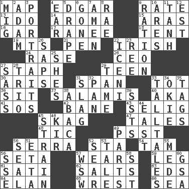 ACROSS 1. Atlas unit 4. _ Allan Poe 9. Pace 13. Wedding promise 14. Scent 15. Ancient river in northeast Turkey 16. Slender fish 17. The wife of a rajah (variant) 18. Portable shelter 19. Mountains (abbr.) 21. Writing instrument 22. From or relating to Ireland 24. To erase 26. Corporate head (abbr.) 27. Staphylococcus 29. Adolescent 30. Ascend 31. Connect, as a bridge 33. Small child 36. Be seated 37. Deli grouping 40. Alias (abbr.) 41. Distress signal 42. Object of repulsion 43. Former Milwaukee Brewers owner Bud 45. Heroin 47. Stories 48. Nervous spasm 49. Inconspicuous attention getter 50. Spanish missionary in California 52. R.R. building 54. Scottish cap 56. Bristle 57. Erodes 59. Part of a journey 61. Suttee (variant) 62. Table seasonings 63. Begley and Asner 64. Style 65. Obtain by seizing forcibly or violently 66. Ocean DOWN 1. Russian fighter aircraft 2. First man 3. Likenesses of persons 4. Ewer handle 5. Window treatment 6. Went 7. So be it 8. Actress Charlotte 9. Food allowance for one day 10. Ancient Greek god of war 11. Hyperbolic tangent 12. Eastern Standard Time (abbr.) 20. Plant excrements 22. Ancient Celtic tribe of eastern Britain 23. Portuguese money of account (variant) 25. "______ My Girl" (Turtles hit) 27. Backtalk 28. Musical group of three 29. Docile 31. Volcanic refuse 32. Baking dish 33. Baron Munchausen's specialties 34. Migrant worker of the '30s 35. Labels 38. Phillipine bananalike plant 39. Fast planes 44. Compass direction 45. Put through a sieve 46. Apertif with cassis 49. Components 50. Lick closed 51. Singer James 52. Wither 53. Story 55. Ancient Persian 56. Compass dir. 57. Compass dir. 58. Fast jet (abbr.) 60. Girls' org. (abbr.)