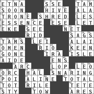 ACROSS 1. Inactive volcano in Sicily 5. Compass dir. 8. Scottish cap 11. Within a short period 12. Hub of activity 14. Chicken ___ king 15. Heavy duty weighing machine 17. Fragment 18. French article 19. Gist 21. Compass dir. 22. Allow 23. Supplement with great effort 24. Turn to the right 25. Fish or hair follower 27. To free from 28. Settles 31. Scottish caps 35. Luau accessory 37. Mountain range southwest of Kyrgyzstan 38. Sign of things to come 39. _ de Janeiro 41. Peachy ____! 42. Went 43. Retirement account (abbr.) 45. Small island 46. Assistant 47. Followers of ems 49. Curve 51. Chop off 52. Lion 55. The grampus (Milton) 57. Actor Linden 60. Catching in a trap 62. Luau course 63. Place in a line 65. Add up to 66. Small child 67. Cause heat under the collar 68. False hair 69. Filthy place 70. Pull behind 71. Ancient Greek god of war DOWN 1. First name in cosmetics 2. Cod relative 3. Trap for birds or small mammals 4. Singer Murray 5. Quiet! 6. The founder of a family 7. Nights before holidays 8. Baron Munchausen's specialties 9. Toward shelter 10. Vertical spar for supporting sails 13. Genesis locale 16. Engineer (abbr.) 17. Sowing specialist 20. To provide with a ceiling 26. 1973 Nobel Price Winner (Physics) Leo 29. Highlander 30. Trig term 31. Ancient Roman robe 32. Mine, in Marseilles 33. Ananias' fault 34. Scornful expression 36. One more than two 40. Threatening words 44. Soon (poet.) 48. Argument over a trivial matter 50. Burn to charcoal 52. 61 cubic inches 53. Related on the mother's side 54. Stares at amorously 55. Chooses 56. Carrot, for example 58. Set down 59. _ and Stitch 61. Roll call or roster of names 64. ___ Haven, CT