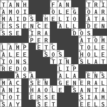 ACROSS 1. Hyperbolic tangent 5. Avid follower 8. Three (prefix) 11. Mine, in Marseilles 12. Cassini of fashion 14. Rowing implement 15. Unmarried girls 17. Sun: prefix 18. _ moment's notice (2 wds.) 19. Gist 21. Everything 22. Lair 23. Compass dir. 24. Retirement account (abbr.) 25. Two (Sp.) 27. For each 28. Smallest unit of an element 31. Desk light 35. And so on (abbr.) 37. Lacquered or enameled metalware 38. Toward shelter 39. Mayday 41. Hollow 42. Charged particles 43. Shallow baking pan 45. Narrow board 46. Make new 47. Mouth edge 49. White ___ sheet 51. According to 52. Followers of ems 55. Apple computer (short form) 57. Elected rep. 60. Commissioned military rank 62. Black tropical American cuckoo 63. White Person, in Hawaii 65. Before Barbara or Clara 66. Small child 67. Celtic language 68. Thailand, formerly 69. Declare 70. Arrange properly for use 71. Snakelike fish DOWN 1. Corrects by punishment or discipline 2. Collect or gather 3. Annoying sound 4. Flintstone garb 5. Enemy 6. Silent film actress Nazimova 7. Famous astronaut Armstrong 8. Inedible or poisonous agaric 9. Assign a rank or rating to 10. SW Asia republic 13. Precious metal 16. Sever or remove by pinching or nipping 17. Centers of feelings and intuitions 20. Algonquian 26. Curses 29. Water jar 30. Rendezvous 31. Den 32. Medicinal plant 33. Ananias' fault 34. Mexican monetary units 36. Small bed 40. Fodder prepared in a silo 44. "Death on the ____" 48. Zero-star reviews 50. American tennis player Robert 52. Bert's buddy 53. Relating to or accompanying birth 54. Criticizes harshly 55. Floor coverings 56. Small Philippine buffalo 58. Hearing organs 59. Olfactory organ 61. Comfort 64. Allow