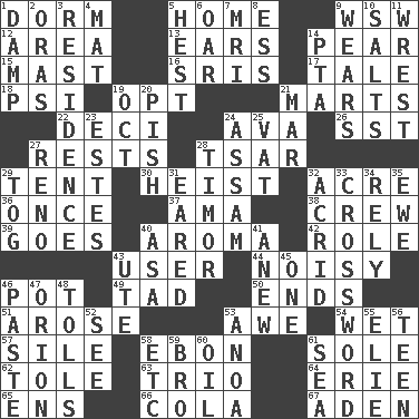 ACROSS 1. Dormintory (informal) 5. Dwelling 9. Compass dir. 12. Length times width 13. Hearing organs 14. Lightbulb-shaped fruit 15. Vertical spar for supporting sails 16. Indian titles of respect 17. Story 18. 23rd letter of the Greek alphabet 19. Choose 21. Shops 22. Tenth: prefix 24. Actress Gardner 26. Fast jet (abbr.) 27. Musical pauses 28. Russian ruler of old 29. Portable shelter 30. Robbery 32. 43,560 square feet 36. At one time in the past 37. Wet nurse (var.) 38. Group working together 39. Leaves 40. Scent 42. Hero or heavy, e.g. 43. One who uses or employs something 44. Annoyingly loud 46. Cooking vessel 49. Small boy 50. Extremities 51. Came up 53. Deep reverence 54. Dripping 57. Filth; sediment 58. Inky black, to poets 61. Flatfish 62. Lacquered or enameled metalware 63. Musical group of three 64. 4th largest of the Great Lakes 65. Followers of ems 66. Root beer relative 67. Arabian gulf DOWN 1. Moist 2. Mouths or openings 3. Home 4. Floor protector 5. Command 6. Boat paddle 7. Medical imaging device (abbr.) 8. Double-curved letter 9. Erodes 10. Table seasonings 11. Obtain by seizing forcibly or violently 14. Parent Teacher Assoc. 19. Sep. follower 20. Expression of disdain 21. Third mo. 23. _____ Park, CO 24. Indian state 25. Large container 27. Western Nevada city 28. The easternmost of the Lesser Sundas 29. Coat; cloak 31. Having ears or earlike features 32. Sour-tasting 33. What you're doing now 34. Trust 35. She-sheep 40. White ___ sheet 41. Afresh 43. Shoshoni 45. Single 46. Thick mixture 47. Greek mythologigal hunter 48. For Whom the Bell _____ 52. Perceive with the eye 53. Small Philippine buffalo 55. Writer Wiesel 56. Adolescent 58. And so on (abbr.) 59. Sis' sibling 60. Petroleum 61. Ocean
