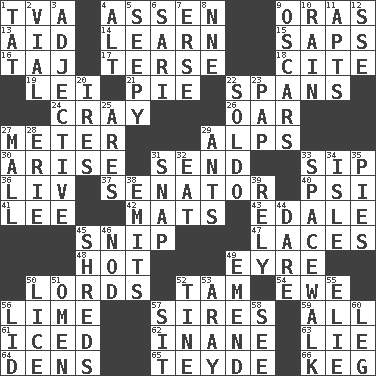 ACROSS 1. Federal power corp. 4. NE Netherlands city 9. Mouths or openings 13. Help 14. Memorize 15. Plant excrements 16. _ Mahal 17. Laconic 18. Quote 19. Luau accessory 21. Sliced dessert 22. Connects, as a bridge 24. Supercomputer manufacturer 26. Rowing implement 27. Distance measurement 29. High mountains 30. Originate 31. Post 33. Small drink 36. 54 in ancient Rome 37. Legislator 40. 23rd letter of the Greek alphabet 41. Area sheltered from the wind 42. Floor coverings 43. Peak District village in England 45. Clip 47. Shoestrings 48. Being at a high temperature 49. Jane of fiction 50. Nobles 52. Scottish cap 54. She-sheep 56. Citrus frut 57. Fathers 59. 100% 61. On the rocks 62. Empty; void 63. Falsehood 64. Hiding places for outlaws 65. Miss Universe 1986, Barbara Palacios _ 66. Barrel DOWN 1. Make lace 2. Small bottle 3. Descriptive word 4. The first octave above the treble staff 5. Oozy 6. Indian skirt 7. Celtic language 8. Compass dir. 9. Motion picture awards 10. Precipitation 11. Flats, for short 12. Compass dir. 20. Angers 22. Twentieth part of a lira 23. Infant food 25. Ancient Greek god of war 27. Shopping center 28. 4th largest of the Great Lakes 29. Pismires 31. Fastener 32. Consume 33. High altitude stroll 34. Capri or Wight 35. Sliced desserts 38. Sends forth 39. Trust 44. Have the gumption 45. Fragments 46. Lower and raise head in agreement 49. Make improvements or corrections to 50. Louse (plural) 51. Presage 52. Prong on a fork 53. Like ___ of sunshine 55. Writer Wiesel 56. Hat (slang) 57. Be seated 58. Perceive with the eye 60. Part of a journey