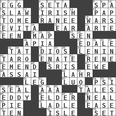 ACROSS 1. Oval reproductive body of a fowl 4. Stalk of a moss capsule 8. Health resort 11. Cole _ (cabbage dish) 13. From or relating to Ireland 15. Infant food 16. Heavy book 17. The wife of a rajah (variant) 18. Armed conflicts 19. Webber/Rice musical 21. Ewer handle 22. Johnson of "Laugh-In" 23. Car or cant ending 24. Atlas unit 27. Elected rep. 29. Capital of Western Samoa 30. Peak District village in England 34. Make lace 36. "Vaya con ____" 39. Soviet premier 1918-24 40. Pacific island yam 41. Related on the mother's side 43. French philosopher Descartes 44. Make improvements or corrections to 46. Indian titles of respect 47. She-sheep 48. Slender Brazilian palm 49. Cowardly lion portrayer 51. Part of a journey 53. Nilotic language 54. 23rd letter of the Greek alphabet 57. Lick closed 60. American Automobile Association (abbr.) 63. Falsehoods 65. Whirlpool 66. A person who is older than you are 69. Anneal 70. Sliced dessert 71. Dipping utensil 72. Relaxation 73. "___ Little Indians" 74. Small island 75. Arrange properly for use DOWN 1. First name in cosmetics 2. Michael Jackson trademark 3. Street urchin 4. Title for a knight 5. Epoch 6. Prong on a fork 7. At sea 8. Practice fight 9. Piece 10. Domed church section 12. Soggy 14. Possessive pronoun 18. Nomad 20. Electrical Unit 25. Helper 26. Aches 28. Snakelike fish 29. Without tonality 31. Afresh 32. Actor's bit 33. Compass dir. 34. Scottish caps 35. Ancient Greek god of war 37. Boat paddle 38. Free of sound 40. Beverage made from leaves 42. He sold his birthright 45. Pass on 50. Being at a high temperature 52. Highlander 54. Entreaties 55. Gospel singer Marvin 56. Small island 57. Back-to-school mo. 58. Singer Brickell 59. An important port of Yemen 61. Mountain range southwest of Kyrgyzstan 62. Does sums 64. One (Scot) 67. Pipe bend 68. Portuguese money of account (variant)