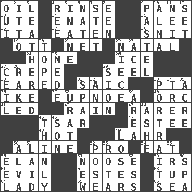 ACROSS 1. Petroleum 4. Remove soap 9. Baking dishes 13. Shoshoni 14. Maternal 15. Toward shelter 16. Call ___ day 17. Ingested 18. Stricken, poetically 19. Baseball player Mel 21. Remaining after all deductions 22. Brizilian seaport 24. Residence 26. Frozen water 27. Streamer paper 29. Sew up the eyelids of hawks and falcons 30. Having ears or earlike features 31. Ketch in the Levant 33. Parent Teacher Assoc. 36. Mamie's husband 37. Normal relaxed breathing 40. The grampus (Milton) 41. Directed 42. Precipitation 43. More uncommon 45. Russian ruler of old 47. First name in cosmetics 48. Being at a high temperature 49. Cowardly lion portrayer 50. Place in a line 52. Adept person 54. Erode 56. Style 57. Trap for birds or small mammals 59. Big collection agency 61. Morally bad or wrong 62. _____ Park, CO 63. Uncastrated adult male sheep 64. Kenny Rogers chart-topper in '80 65. Erodes 66. Ocean DOWN 1. Fr. "Yes" 2. "Tell ____ the Marines!" 3. Resembling or made to resemble leather 4. To riddle 5. Silly 6. Nathan's nickname 7. Proofreading order 8. Car or cant ending 9. Soft color 10. _ mater 11. Famous astronaut Armstrong 12. Put into a specified state 20. Drink excessively 22. Sibling's daughter 23. Adept person 25. Ancient Persian 27. To provide with a ceiling 28. Immoral or dissolute person 29. The Jewish people; Israel 31. Practice fight 32. Cuckoo 33. Likenesses of persons 34. Woody plant 35. Measure of real estate 38. A salt of uric acid 39. Length times width 44. American tennis player Robert 45. Without thickness 46. Male offspring 49. Failure 50. Inventor's middle name 51. Put down 52. Introduce or present, as a question 53. Round or rotation of duties 55. Loyal 56. Snakelike fish 57. ___ Haven, CT 58. Double-curved letter 60. Health resort