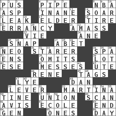 ACROSS 1. Product of festering 4. Corncob 8. Basketball assoc. 11. Cleo's killer 12. Silly 14. Fly high 15. Path through which fluid escapes 17. A person who is older than you are 18. Hoop that covers a wheel 19. Tendancy to err 21. Collect or gather 23. Compete 24. A saturated hydrocarbon 25. Fastener 27. Collude with 30. Modern: prefix 31. A viewer who gazes fixedly 34. Health resort 37. Followers of ems 38. Leaves out 39. Car dealer's back yard 40. Compass dir. 41. Makes clutter 43. Shoshoni 44. French philosopher Descartes 45. Labels 47. Sodium hydroxide 49. Daniel's nick name 50. Prying instrument 52. Chrissie's court nemesis 56. Prong on a fork 57. The state of being joined or united 60. Glance over 61. Advice 62. Learning spot: Fr. 63. Conclusion 64. Commissioned mil. rank 65. Washington bills 66. 24 hours DOWN 1. Light colored 2. One who makes use of a thing 3. Practice fight 4. Component 5. In an inward manner 6. Writing tablet 7. Compass dir. 8. Annoying sound 9. Soap units 10. "We ___ not amused" (Victoria) 13. Period 14. Comedian Laurel of Laurel & Hardy 16. Polynesian shrub of the pepper family 20. Cuts off 22. Floor covering 25. Elected reps. 26. Olfactory organ 27. Ascend 28. Antes 29. Celtic language 30. Born 32. Heavy book 33. So be it 34. Strike heavily 35. Cooking vessels 36. Had dinner 42. Play the lead 44. To riddle 46. Pismires 47. Soviet premier 1918-24 48. Jacques Cousteau's middle name 49. Natives or inhabitants of Denmark 50. Moving, as bait 51. Sorrow 52. Undercover agent 53. On the rocks 54. Nanny 55. "60 Minutes" Commentator Rooney 56. Label 58. Non-commissioned officer (abbr.) 59. Electrically charged atom
