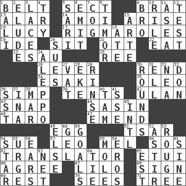 ACROSS 1. Waist strap 5. Religious group 9. Naughty child 13. Having or resembling wings 14. Mine, in Marseilles 15. Get up 16. "I Love _" 17. Complicated, petty procedures 19. Binary compound 20. Be seated 21. Baseball player Mel 22. Ingest 23. Son of Isaac 25. Portuguese money of account (variant) 26. Prying instrument 30. Tear apart 34. 1973 Nobel Price Winner (Physics) Leo 35. Margarine 36. Simple or foolish person 39. Portable shelters 42. Uhlan (variant) 43. Fastener 44. Indian antelope 46. Pacific island yam 47. Make improvements or corrections to 48. Oval reproductive body of a fowl 51. Russian ruler of old 54. Institute legal proceedings 57. Lion 58. Cartoonist voice _ Blanc 60. Distress signal 62. Interpreter 65. Needle holder 66. Match 67. _ and Stitch 68. Signal 69. Respite 70. Perceives with the eye 71. Family _ (genealogy) DOWN 1. Indonesian resort city 2. Evade 3. Shoestrings 4. Attempt to accomplish something 5. Indian skirt 6. Give off 7. Gear tooth 8. Southeast Indonesia island 9. Sis' sibling 10. Cause heat under the collar 11. Toward the sea 12. Trial 15. Johnson of "Laugh-In" 18. Had dinner 20. Takes to court 24. City in Syria 27. Large container 28. Make supply last 29. Remove soap 30. Periods in a boxing match 31. Pipe bend 32. Teachers' org. 33. Spanish title 36. Fast jet (abbr.) 37. _ tizzy (2 wds.) 38. Third mo. 40. Scottish cap 41. Compass dir. 45. International (abbr.) 48. Otherwise 49. Set 50. Purposes of endeavors 52. Moving or stirring 53. Makeup applied to the cheeks 54. Play the lead 55. Goad 56. Hearing organs 58. Undercover agent 59. Greek god of love 61. Trig term 63. Fish or hair follower 64. Make a knot 65. Eastern Standard Time (abbr.)