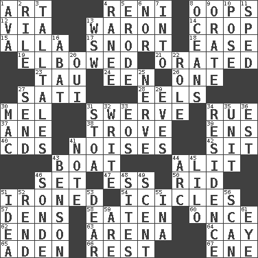 ACROSS 1. Tate display 4. Painter Guido (1575-1642) 8. I made a mistake 12. By way of 13. Make _____ (do battle with) 14. Riding implement 15. Silent film actress Nazimova 17. Derisive sound 18. Comfort 19. Shoved, as through a crowd 21. Spoke pompously 23. The 19th letter of the Greek alphabet 24. Car or cant ending 26. Single 27. Suttee (variant) 28. Snakelike fish 30. Cartoonist voice _ Blanc 31. Turn aside suddenly 34. Sorrow 37. A saturated hydrocarbon 38. Collection of objects 39. Followers of ems 40. Music discs 41. Annoying sounds 42. Be seated 43. Water vessel 44. Set down 46. Arrange properly for use 47. Curvy letter 50. To free from 51. Pressed 54. Winter's stalactites 57. Cub Scout units 58. Consumed 60. At one time in the past 62. Inside; within (prefix) 63. Sports stadium 64. Island 65. An important port of Yemen 66. Remainder 67. Compass dir. DOWN 1. Actress Gardner 2. Cause heat under the collar 3. Baron Munchausen's specialties 4. Indian princess (variant) 5. Eat (away) 6. And not 7. To the inside or interior of 8. Seas 9. Speak pompously 10. Introduce or present, as a question 11. Hurried 13. Compass dir. 16. Blind as ____ 20. Fr. "Yes" 22. Hero or heavy, e.g. 25. Boldness 27. Post 29. Nights before holidays 30. Big _ 31. Portico 32. Compose 33. Greek goddess of the dawn 34. Home 35. A single undivided whole 36. Eastern Standard Time (abbr.) 41. Make mention of 43. Gillaume's butler role 44. Curve 45. _ and Stitch 46. Something which is sent 48. Settings 49. Odor 51. The content of cognition 52. Tear apart 53. Letter starter 55. _ tizzy (2 wds.) 56. Glance over 59. "We ___ not amused" (Victoria) 61. Sight organ