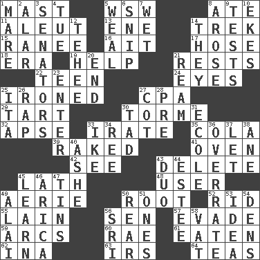 ACROSS 1. Vertical spar for supporting sails 5. Compass dir. 8. Had dinner 11. Eskimo relative 13. Compass dir. 14. Long journey 15. The wife of a rajah (variant) 16. Small island 17. Flexible conduit 18. Epoch 19. Aid 21. Musical pauses 22. Adolescent 24. Sight organs 25. Pressed 27. Tax preparer (abbr.) 29. Small pie 30. Singer Mel 32. Domed church section 33. Feeling or showing extreme anger 35. Root beer relative 39. Swept the length of 41. Baking chamber 42. Perceive with the eye 43. Keyboard key 45. Thin strip of wood or metal 48. One who makes use of a thing 49. Nest on high 50. Carrot, for example 52. To free from 55. (Had) reclined 56. Elected rep. 57. Elude 59. Arches 60. Actress Charlotte 61. Eroded 62. _ tizzy (2 wds.) 63. Big collection agency 64. Beverages made from leaves DOWN 1. Female horse 2. Having or resembling wings 3. Elected representatives 4. Third day of the wk. 5. Welt 6. Sever or remove by pinching or nipping 7. Soggy 8. Came up 9. Trials 10. Supplements with great effort 12. Giggle 14. Those people 20. Conclusion 21. 480, 500 or 516 sheets of paper 23. Keyboard key 25. Call ___ day 26. Reproach for some lapse or misdeed 27. Small bed 28. Before (prefix) 30. Bit 31. Learning spot: Fr. 33. Eisenhower's nickname 34. To sift 36. Make much ado about nothing 37. Allow 38. One (Scot) 40. American tennis player Robert 43. Superhero pair 44. First name in cosmetics 45. Acquire or gain knowledge or skills 46. N. Chile seaport 47. Metal containers 49. Mountain range southwest of Kyrgyzstan 50. Located in or toward the back 51. Singles 53. The main thing one is thinking about 54. Lairs 56. _ Lanka 58. Large container