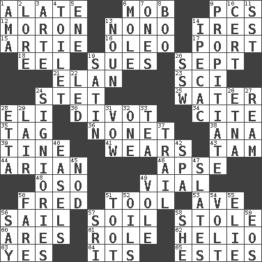 ACROSS 1. Having winglike extensions 6. Disorderly crowd 9. Personal Computers (abbr.) 12. Person of subnormal intelligence 13. Words to Nanette 14. Angers 15. Nick name for Arthur 16. Margarine 17. Left side of a ship or aircraft 18. Snakelike fish 19. Takes to court 20. Back-to-school mo. 21. Style 23. _-fi 24. Proofreading order 25. Wetness 28. Connecticut Ivy Leaguer 30. A piece of turf (Scot.) 34. Quote 35. Label 36. Music written for nine 38. Santa ___, CA 39. Prong on a fork 41. Erodes 43. Scottish cap 44. Believer in; advocate of (suffix) 46. Domed church section 48. Bear (Spanish) 49. Small bottle 50. Flintstone 51. Instrument 53. "___ Maria" 56. Travel by water 57. Earth 58. Fur scarf 60. Ancient Greek god of war 61. Hero or heavy, e.g. 62. Sun: prefix 63. Consenting reply 64. It is 65. _____ Park, CO DOWN 1. Wet nurse (var.) 2. Old wives' tales, e.g. 3. Johnson of "Laugh-In" 4. Bathroom 5. Compass dir. 6. Undercover agent 7. Washington bills 8. Oct. 31 cry 9. Appease 10. Sure thing 11. Fast jet (abbr.) 13. Part of speech 14. Medicinal drug used to evoke vomiting 19. Smooth fabric 20. Compass dir. 22. Directed 24. Seigniories (variant) 26. Inactive volcano in Sicily 27. 480, 500 or 516 sheets of paper 28. Singer James 29. Den 31. Promise 32. Single 33. Afternoon social gathering 37. Hang back 40. Artist's stands 42. Health resort 45. Lower and raise head in agreement 47. Chalkboards 49. Grand slam 50. Conductor's collection 51. A blast of a horn 52. Lubricates 54. Electrical Unit 55. Writer Wiesel 56. Declare 57. Indian title of respect (Mr.) 58. A female animal or person 59. Greek goddess of the dawn