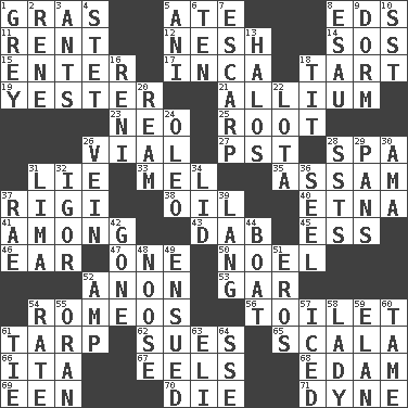 ACROSS 1. Pate de foie ____ 5. Had dinner 8. Begley and Asner 11. Monthly bill 12. Delicate 14. Distress signal 15. Keyboard key 17. South American Indian 18. Small pie 19. Next before 21. Plant genus of onion and garlic 23. Modern: prefix 25. Carrot, for example 26. Small bottle 27. Pacific Standard Time (abbr.) 28. Health resort 31. Falsehood 33. Cartoonist voice _ Blanc 35. Indian state 37. Swiss mountan, "Queen of the Mountains" 38. Petroleum 40. Inactive volcano in Sicily 41. Amid 43. Pat or tap gently 45. Curvy letter 46. Hearing organ 47. Single 50. Christmas carol 52. Soon (poet.) 53. Slender fish 54. Lover boys 56. Bathroom 61. Canvas cover 62. Takes to court 65. Any of the three canals of the cochlea 66. Call ___ day 67. Snakelike fish 68. Dutch treat 69. Car or cant ending 70. Pass on 71. Centimeter-gram-second unit of force DOWN 1. Jennifer or Joel 2. French philosopher Descartes 3. Pismires 4. Proofreading order 5. Cuckoo 6. "___ Little Indians" 7. Fortification 8. He sold his birthright 9. Dormintory (informal) 10. Fast jet (abbr.) 13. Saint headwear 16. Painter Guido (1575-1642) 18. Teat (slang) 20. 480, 500 or 516 sheets of paper 22. Globular water bottle used in Asia 24. Margarine 26. Distinctive style or manner 28. Fast planes 29. Zero-star reviews 30. Housemaid (var.) 31. Pale green bean 32. Composer Stravinsky 34. Hat (slang) 36. Stitch closed the eyes of (a falcon) 37. Actress Charlotte 39. Austrian-born American filmmaker Fritz 42. Went 44. Water vessel 48. Trap for birds or small mammals 49. Followed as a consequence or result 51. Greek god of love 52. Electrical Unit 54. Pace 55. NW Algerian seaport 57. On the rocks 58. Kenny Rogers chart-topper in '80 59. Enthusiasm 60. Docile 61. Make a knot 63. Connecticut Ivy Leaguer 64. Compass dir.