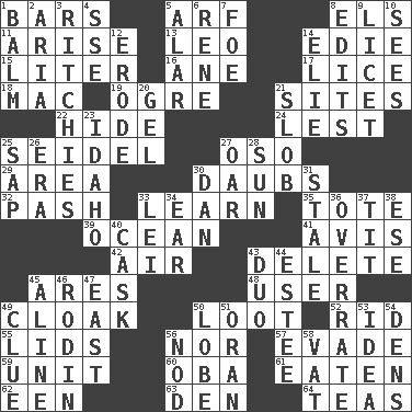 ACROSS 1. Soap units 5. Sandy's bark 8. Raised railways 11. Originate 13. Lion 14. Singer Brickell 15. 61 cubic inches 16. A saturated hydrocarbon 17. Louse (plural) 18. Apple computer (short form) 19. Legendary monster 21. Locates 22. Flintstone garb 24. For fear that 25. Beer mug 27. Bear (Spanish) 29. Length times width 30. Applies to a surface 32. Romantic infatuation 33. Acquire or gain knowledge or skills 35. Haul 39. Sea 41. Deliberation 42. Wind 43. Erase 45. Ancient Greek god of war 48. One who uses or employs something 49. Cover or conceal 50. Plunder 52. To free from 55. Hats (slang) 56. And not 57. Dodge 59. A single undivided whole 60. Chief or king in Benin or Nigeria 61. Eroded 62. Car or cant ending 63. Lair 64. Afternoon social gatherings DOWN 1. Lip ointment 2. Operatic vocal solo 3. Actors Guy, Robert Welles, and Clint 4. Compass dir. 5. Having or resembling wings 6. French philosopher Descartes 7. Enemy 8. Prepares for publication 9. It is permitted: Lat. 10. Perceives with the eye 12. Eat (away) 14. Writer Wiesel 20. Set 21. Messy guy 23. Potato state 25. Plant excrement 26. Epoch 27. Boat paddle 28. Player for Phoenix 30. One of the 12 tribes of Israel 31. Having lost freshness 33. Luau accessory 34. Hearing organ 36. Make much ado about nothing 37. Teat (slang) 38. Compass dir. 40. Keg 43. Superhero pair 44. First name in cosmetics 45. Place in a line 46. "The Thinker" sculptor 47. 90 degrees 49. A slight indication 50. Ear part 51. NW Algerian seaport 53. The main thing one is thinking about 54. Cub Scout units 56. Dreamland 58. Large container