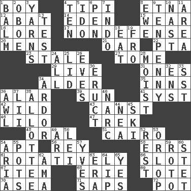 ACROSS 1. Male child 4. Native american tent (variation) 8. Inactive volcano in Sicily 12. Blind as ____ 14. Locale of original sin 15. Put on (as clothing) 16. Old wives' tales, e.g. 17. Unrelated to defense, as in spending 20. Not women's 21. Rowing implement 22. Parent Teacher Assoc. 23. Having lost freshness 27. Heavy book 29. Not recorded 31. Washington bills 34. Tree or shrub in the Birch family 35. Restaurants 36. Having or resembling wings 39. Player for Phoenix 41. System (abbr.) 42. Rampant 43. 2nd pers. sing. pres. of can (arch.) 46. _ and Stitch 47. Long journey 48. Relating to the mouth 51. Capital of Egypt 54. Fitting 56. Marina Del _, California 58. Blunders 61. Rotating or pertaining to rotation 66. Narrow opening 67. A whole individual unit 68. One of the Great Lakes 69. Carryall 70. Toward the sea 71. Plant excrements 72. Plant holder DOWN 1. Lip ointment 2. Mitch Miller's instrument 3. Entertaining tales 4. Nine, plus one 5. Wedding promise 6. Writing instrument 7. Southeast Asian peninsula 8. She-sheep 9. 3-inch nail 10. Political cartoonist Thomas 11. Type of rug 13. Trial 18. Consume 19. From 24. 100% 25. Flaplike covering 26. Nights before holidays 28. Damp 30. Spew [out] 32. Followers of ems 33. Fast jet (abbr.) 34. Zeal 36. Leather borer 37. Cards in a Roman deck? 38. One to whom something is allotted 40. Drug cop 44. Teachers' org. 45. What Jean-Claude Killy likes to do 49. Nonscientific branch of learning 50. Flowery wreath 52. State of inaction 53. Fourth or lowest deck 54. Operatic vocal solo 55. Cooking vessels 57. Jacques Cousteau's middle name 59. Printing process, for short 60. Proofreading order 62. Nanny (var.) 63. Period 64. Mouth edge 65. Affirmative reply